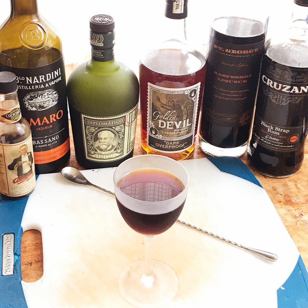 The blended aged rum provides a nice flavorful base of molasses and dark fruit that is boosted by the addition of raspberry liqueur and the darkened molasses notes of the blackstrap rum. Meanwhile, the Amaro Nardini provides a great foil for the richer flavors with notes of bitter dark chocolate and a bit of a licorice/mint undertone, the overproof dark rum provides oomph whole reinforcing the dark fruit and coffee notes, and the bitters round out the spice profile