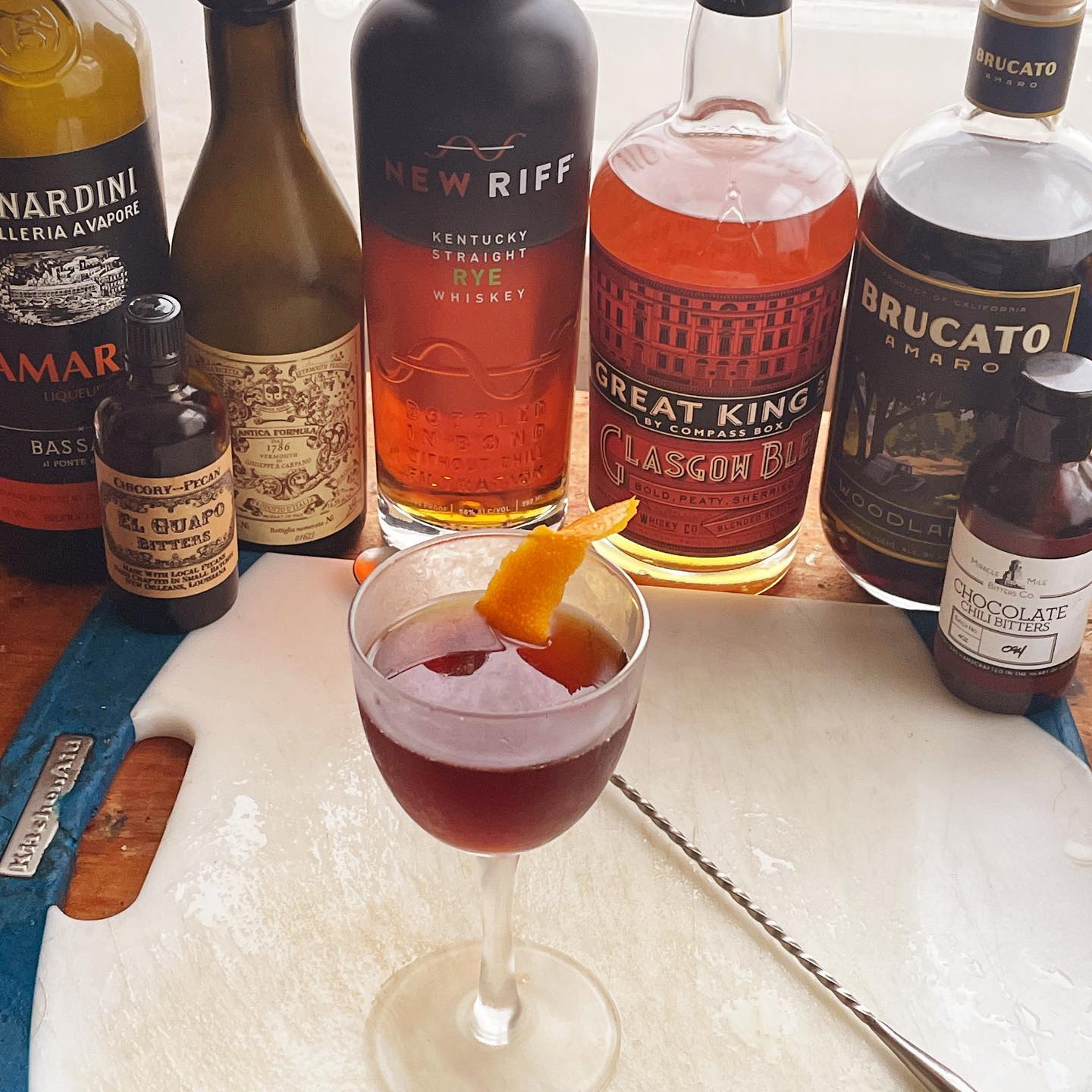 The blend of Bonded rye whiskey and blended Scotch contributes notes of baking spice, honey, and subtle notes of vanilla and smoke that help accentuate the chocolate/cocoa notes in the two Amaros, the sweet vermouth, and chocolate/chile bitters. The Brucato woodlands (berries/red fruit) and Nardini (orange peel, subtle menthol) also add complementary flavor notes while also contributing some bitterness that helps counterbalance any rich notes. The Bitters also lend subtle spice, coffee, pecan notes and the orange twist adds a pleasant aroma to each sip
