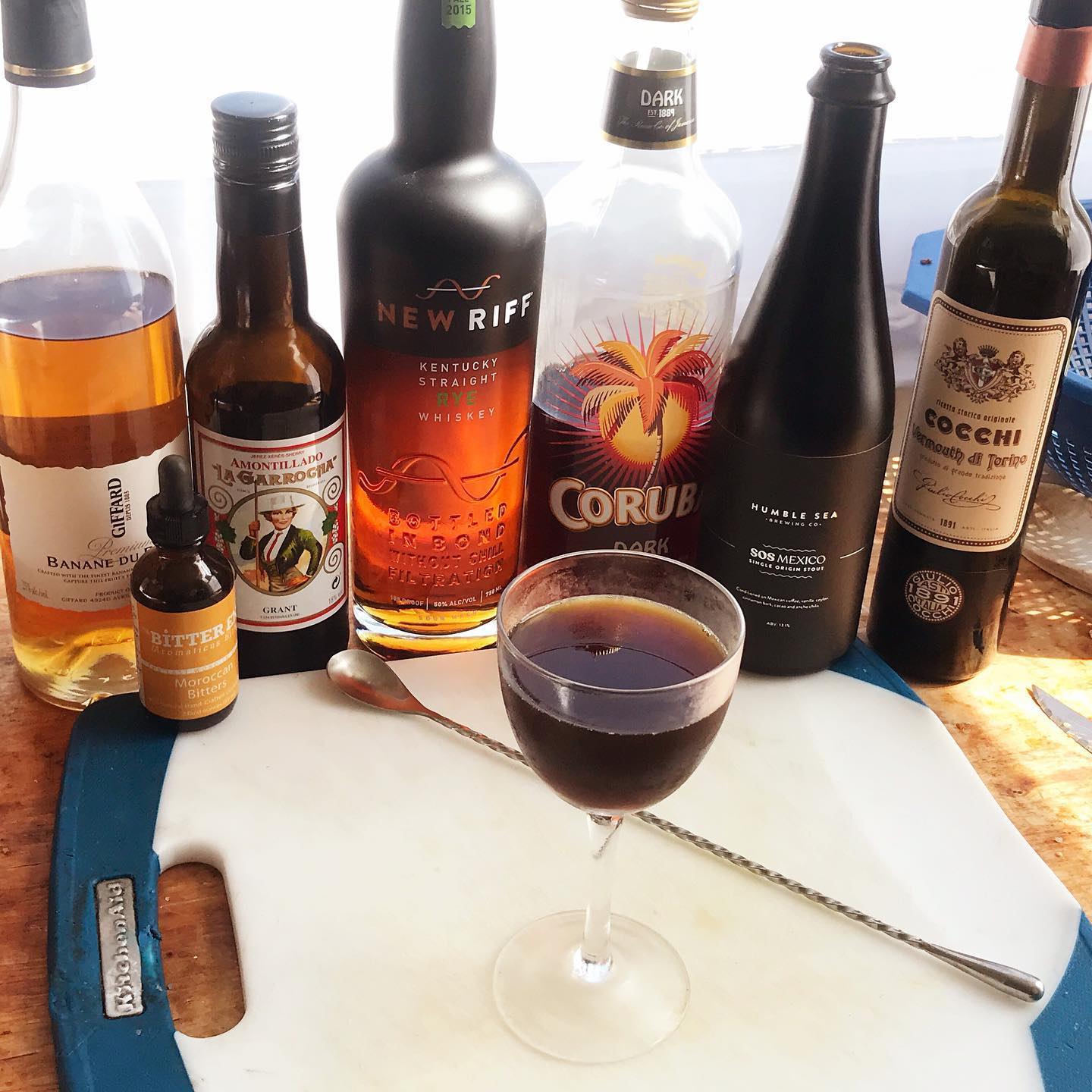 A rich, decadent Manhattan riff inspired by a delicious stout with coffee, ancho chile, cinnamon, and cocoa nibs that can be enjoyed for dessert or as part of a boozy brunch 🍌🥜☕️ The vanilla, caramel and baking spice notes in the rye whiskey combine with the molasses notes in the dark rum, the nutty amontillado sherry, the cocoa notes in the vermouth, and the ripe banana flavor of the liqueur to bring a full arsenal of flavors that complement the coffee and Chile stout. A dash of the Moroccan bitters bring a hint of lemon-y sumac that lightens the richness a bit. Delicious!