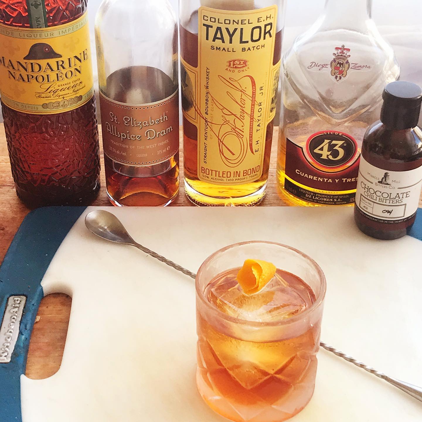 The caremilzed sugar and baking spice notes in the bonded bourbon work nicely with the allspice notes from the liqueur and the hints of vanilla and orange from the splashes of liqueur. The chocolate bitters add a touch of richness and complementary chile spice