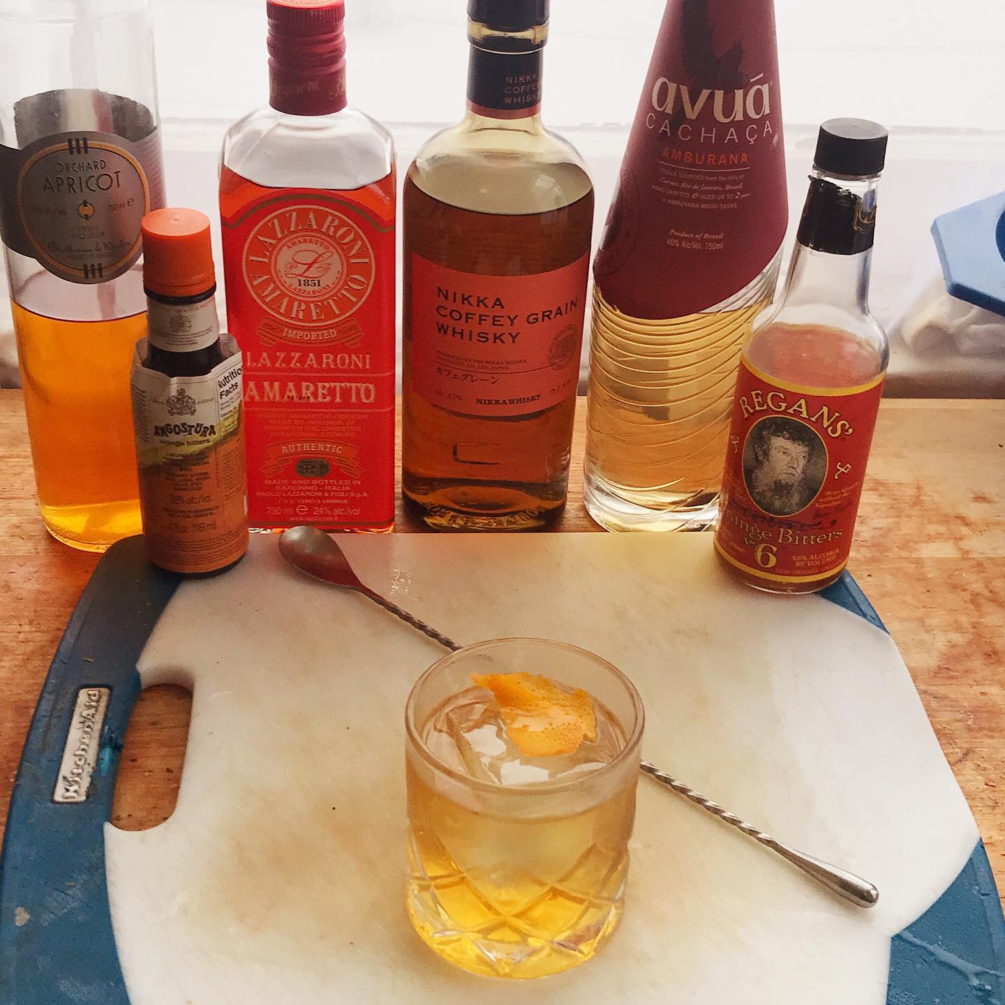 The vanilla and subtle fruit notes in the Japanese grain whisky work beautifully with the oak and tropical fruit notes in the aged cachaca while the Amaretto and Apricot liqueur bring almond cookie and stone fruit accents and the orange bitters add a hint of fresh orange zest and cardamom spice. Outstanding!