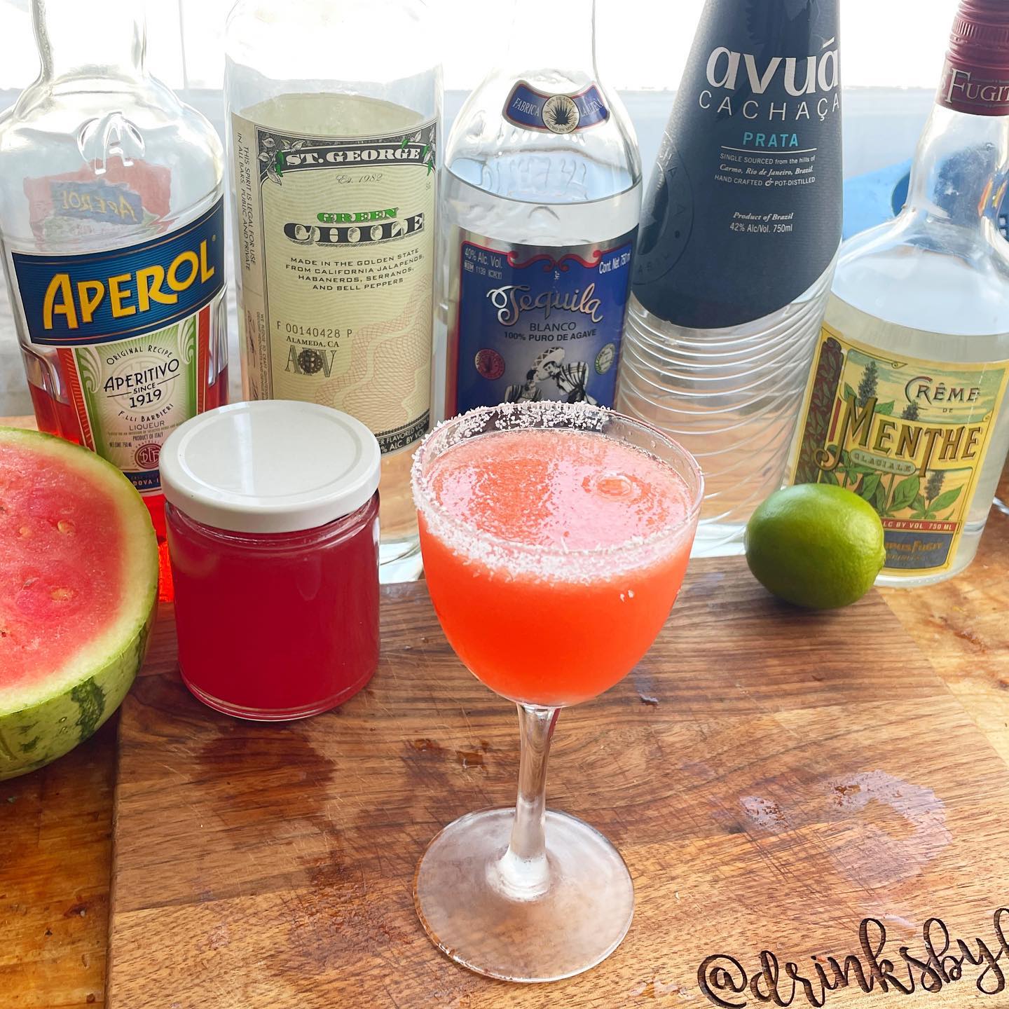 The citrus zest and green bell pepper notes in the unaged tequila combine with the green chile and cilantro notes in the infused vodka to create a base that complements the cooling watermelon syrup and the tart lime juice. Unaged cachaca adds some notes of grassy sugarcane and tropical fruit aroma to the base while the bittersweet Aperol helps bridge the lime and watermelon syrup to the tequila and cachaca. A splash of mint liqueur helps boost the cooling sensations in each sip