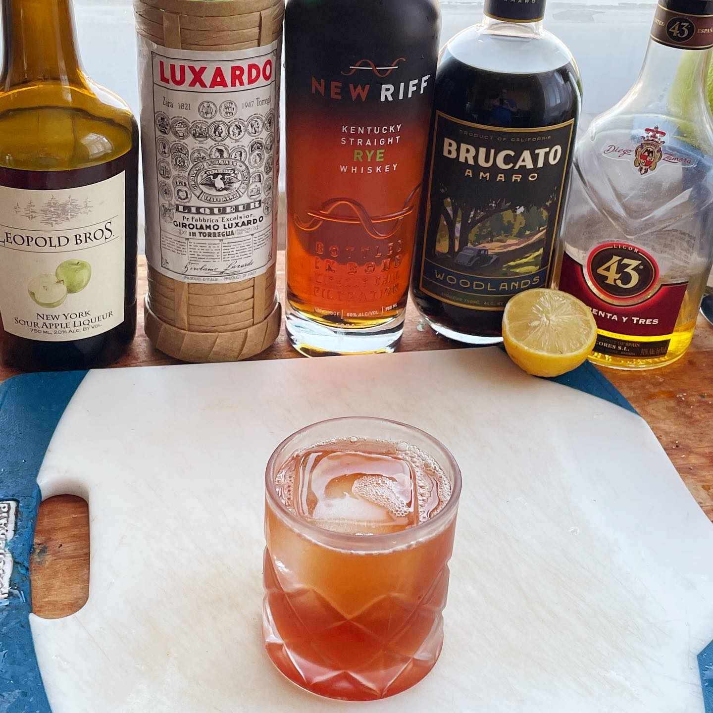 The rye offers notes of vanilla and baking spice that works nicely with the cola/berry/dark chocolate notes in the Amaro. Additions of vanilla liqueur/syrup and a splash of maraschino liqueur help boost the cherry and vanilla flavors while the lemon juice and a splash of the dry/tannic sour apple liqueur help add acidity and a drying finish to balance the drink and complete the cherry/vanilla Coke flavors