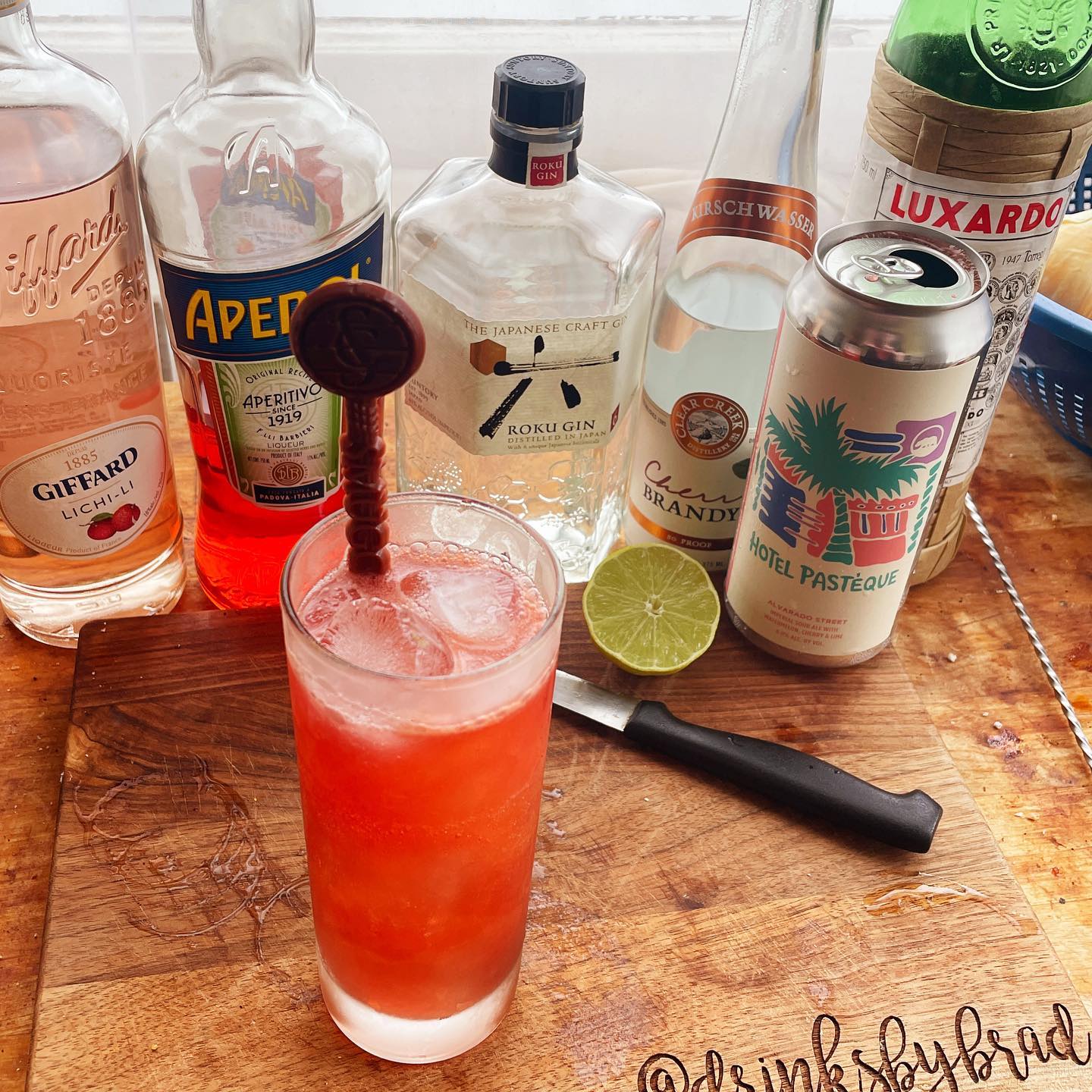 The Japanese gin has notes of yuzu, shiso, and black pepper that play nicely with the citrus notes from the fresh lime juice while the unaged cherry eau de vie adds some depth and funk that picks up the watermelon and cherry sour beer. The citrus peel notes in the Aperol tie together the booze, citrus, and beer notes while a splash of the Maraschino liqueur helps boost the cherry notes and the lychee liqueur complements the other flavors