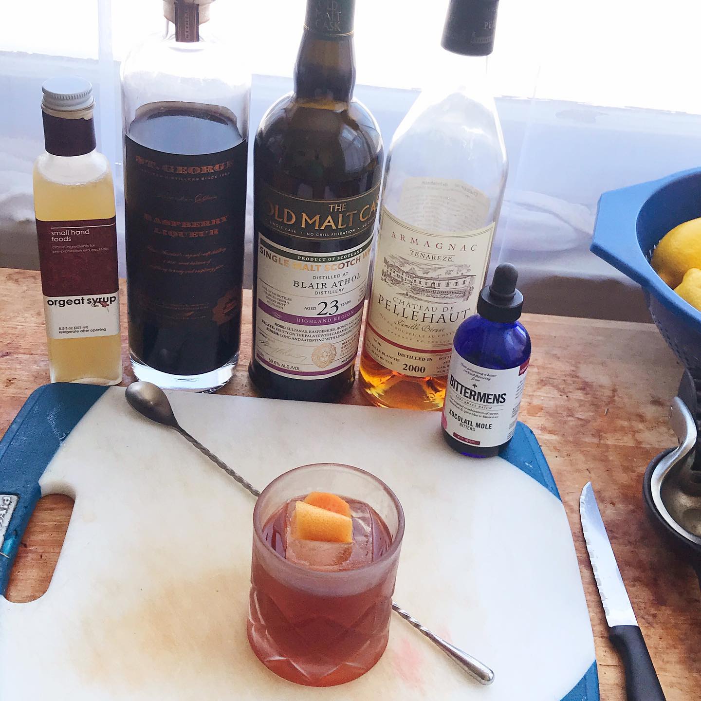 The honey, dark fruit, and subtle peat notes in the cask strength single malt work with the prune and vanilla notes in the Armagnac to provide a very flavorful base. These flavors are accented by dark fruit flavors from the raspberry liqueur, a touch of nutty sweetness from the orgeat, and a touch of chocolate and spice from the chocolate mole bitters. A very fine after dinner sipper!