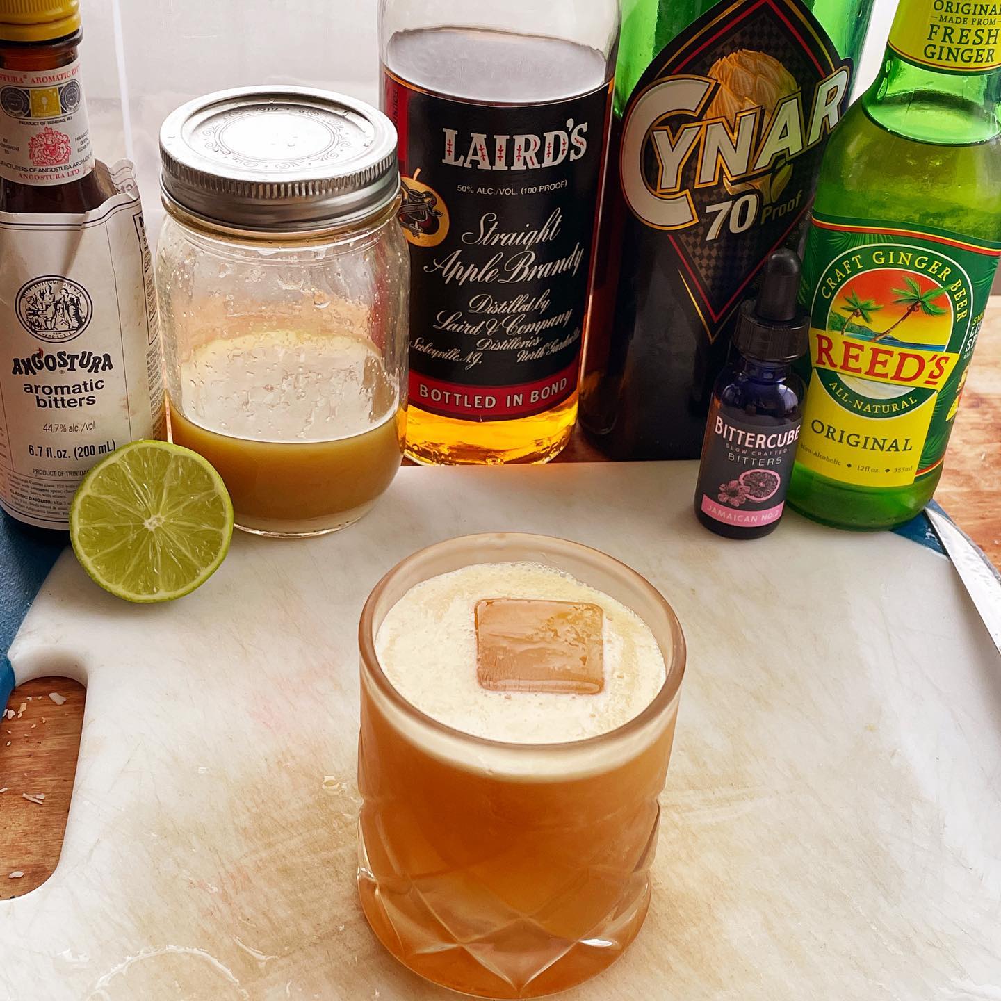 The bonded apple brandy lends some oomph and fruit flavor that works nicely with the ginger bite from the syrup and ginger beer and the tart lime juice. A splash of Cynar lends a bittersweet touch and the bitters add some spice and hibiscus notes