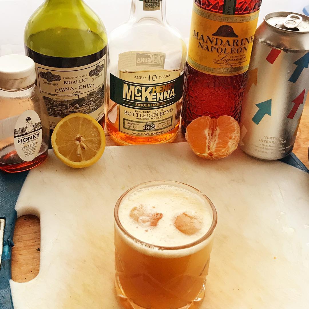 The tangerine flavor from the juice is boosted by the additions of Mandarin liqueur and a bit of French bittersweet liqueur with notes of spice and orange peel. These flavors pair well with the dusty oak and vanilla notes in the bonded bourbon and the juicy hops in the hazy double IPA. The addition of honey syrup adds an undertone of deep sweetness while the lemon juice brings the acidity of the drink into balance