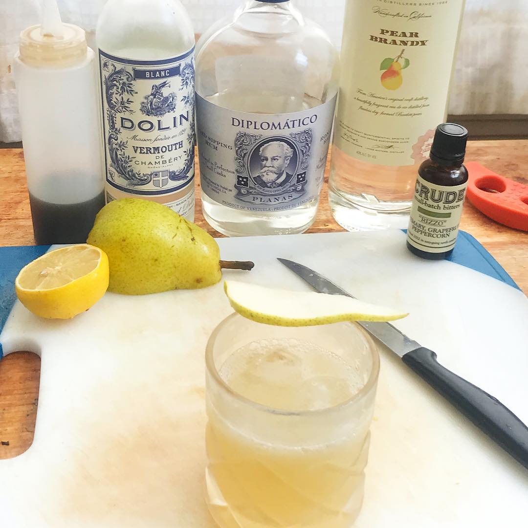 The flavor from the freshly juiced pear is echoed by the pear brandy which both play nicely with some of the tropical esters in the rum. The touches of lemon and blank vermouth brighten the drink without overpowering the pear flavor and the bitters add a touch of herbal spice