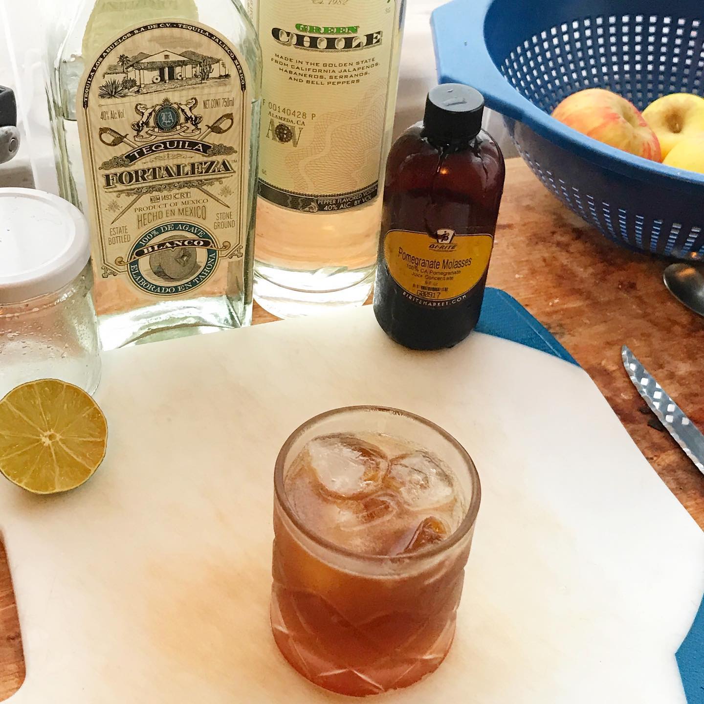The spice and green notes of the jalapeƱo/green chile work very well with the tart, yet sweet pomegranate molasses while the citrus zest notes in the Blanco tequila and fresh lime juice add refreshing balance