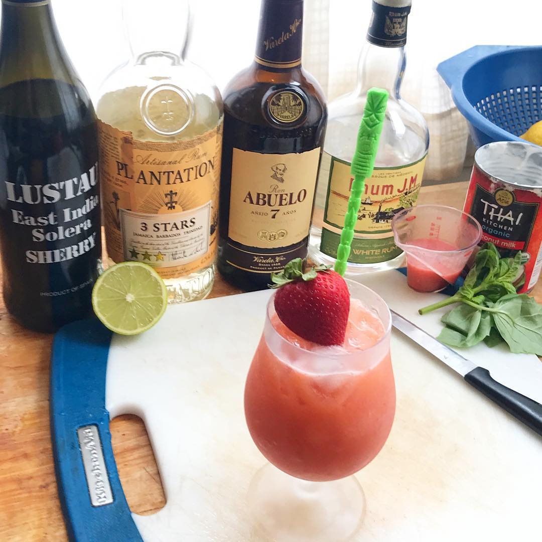 The trio of rums provide a nice base with a bit of a grassy accent from the agricole that showcase the tropical and fruit notes in the strawberry/basil/coconut cream. The rich sherry adds a bit of toffee/currant flavor while the acidity from the lime cuts the richness of the drink