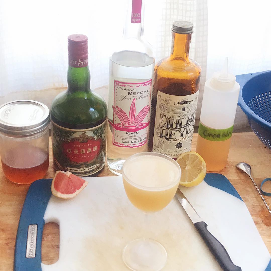 The mezcal pairs really well with both the spicy Ancho Reyes and grapefruit/cinnamon while the honey and Creme de Cacao add depth to the flavor