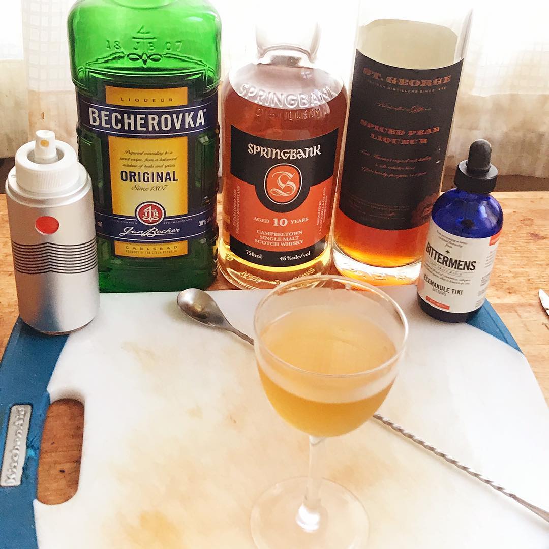 The pear/vanilla/peat notes of the Campbelltown Scotch are complemented by the notes of cinnamon in the Becherovka and Tiki bitters and the baking spices and pear notes in the liqueur. Spritzing with Islay scotch gives a nice campfire aroma