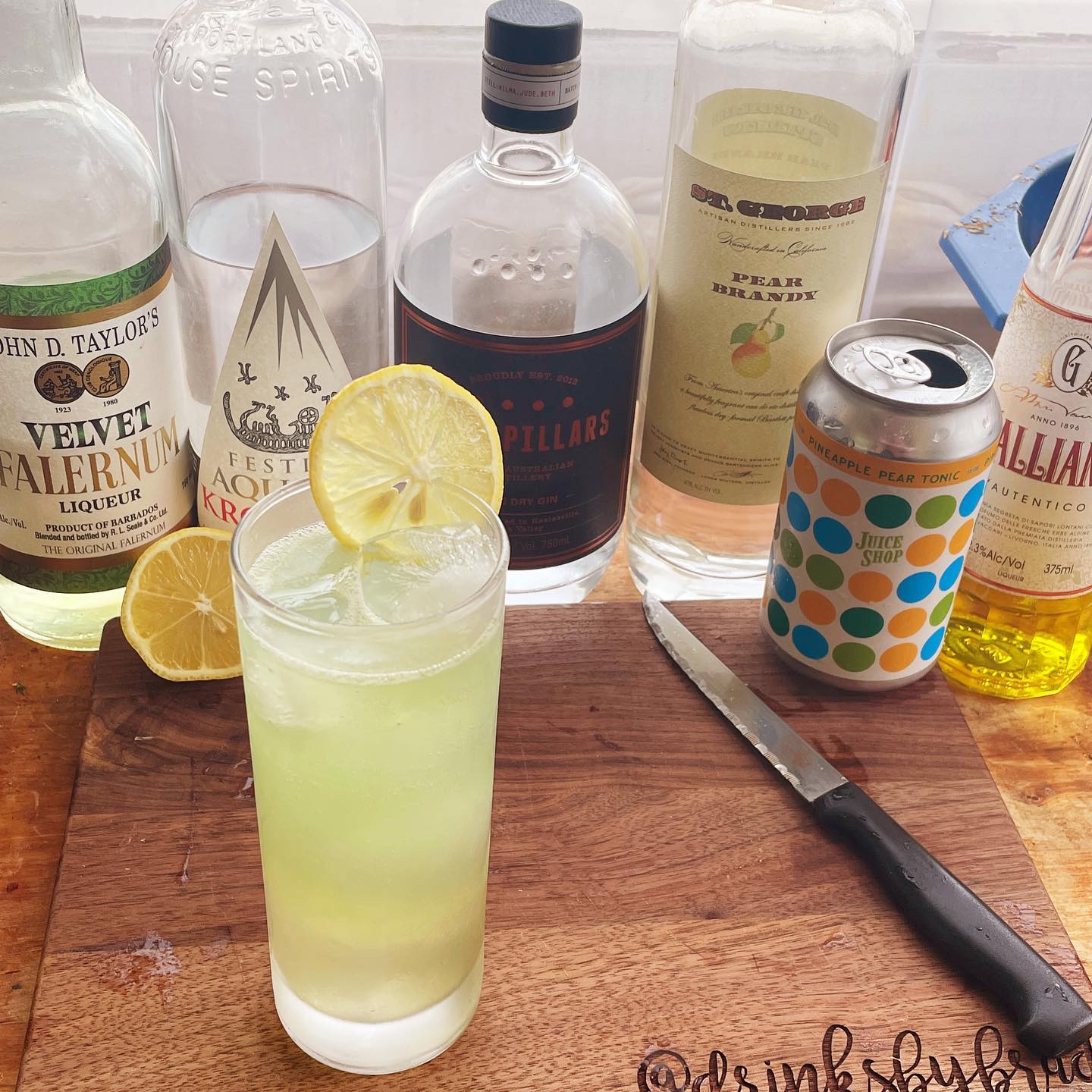 The juniper and other botanical notes in the gin combine with the star anise/fennel notes in the unaged aquavit to form a base that complements the pear notes in the Eau de vie and sparkling water/tonic and the bright lemon juice. The falernum and a splash of Galliano add notes of clove/citrus zest and vanilla that complement the other flavors. Great for a warm day (or wishing one is coming)