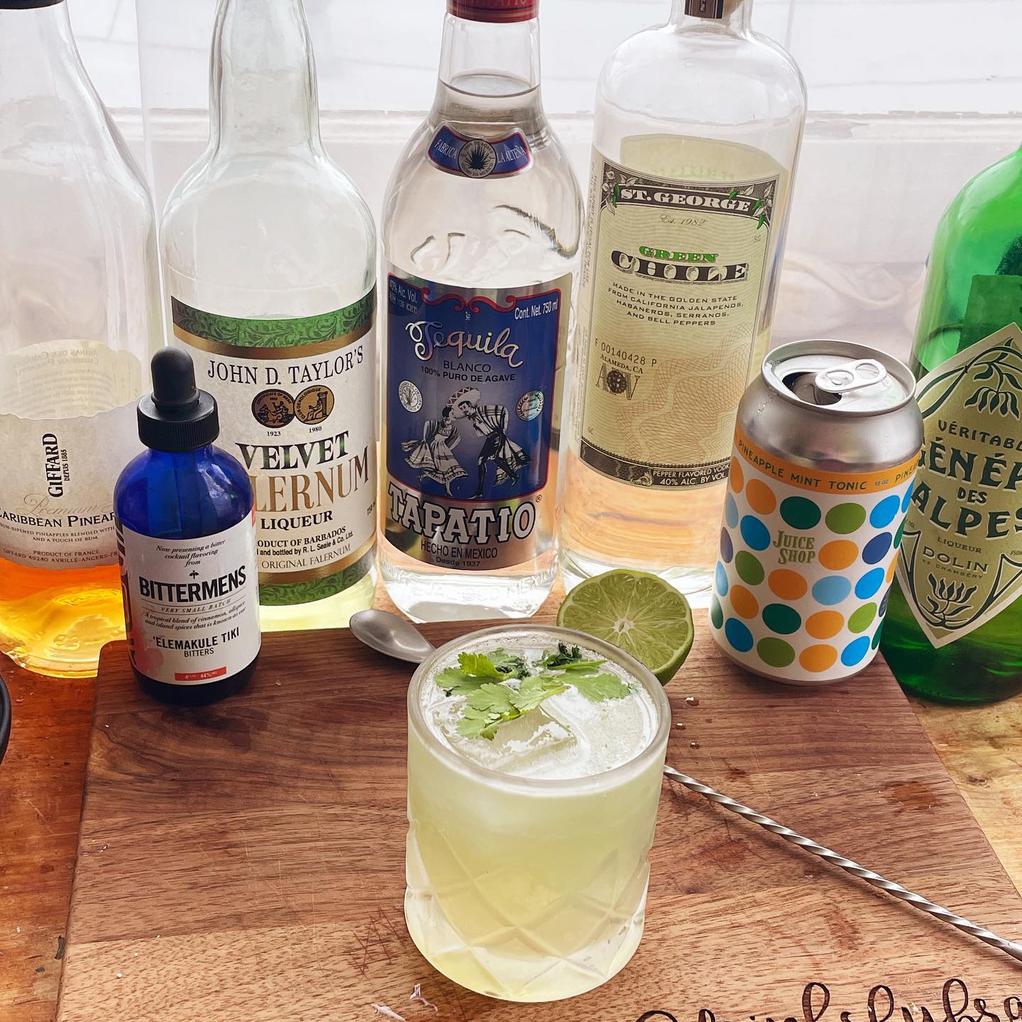 The citrus zest and cracked pepper notes in the unaged tequila combine with the cilantro and green chile notes in the infused vodka to form a savory base that is accented by the herbal notes in the Alpine liqueur, the tropical notes in the pineapple liqueur, the clove/lime zest notes in the Falernum, and the warming ginger and baking spice notes from the Tiki bitters. Fresh lime helps add balancing acidity while helping bridge the flavors and the pineapple mint sparkling water helps add effervescence while boosting the tropical and herbal notes. Fantastic to accompany a plate of tacos or other favorites from Mexico/Central America