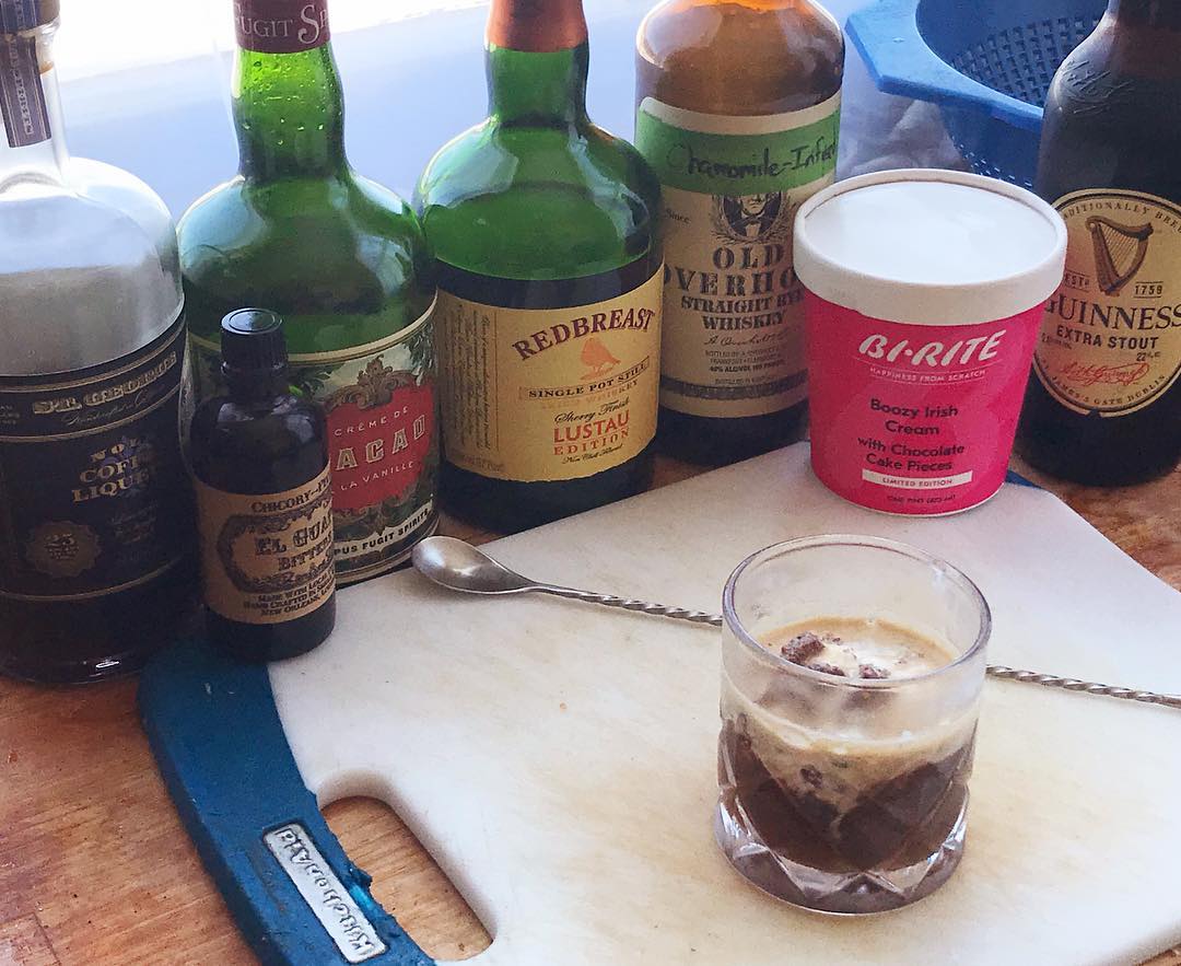 A boozy affogato with some St Pat’s sparkle ☘️🥃🍺 The honey and cereal grain notes of the Irish Whiskey and the bittersweet chocolate notes in the Guinness both work very well with the Bailey’s ice cream richness. The coffee liqueur rounds out the decadent affogato flavors while the Creme de Cacao, chamomile rye, and chicory-pecan bitters bring additional background flavors