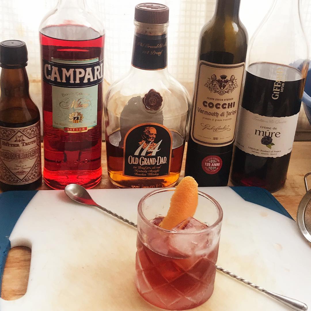 The Campari cuts the richness of the overproof bourbon and sweet vermouth. The fruity notes in the Vermouth di Torino melds really well with the blackberry to give a nice dark fruit accent to this classic