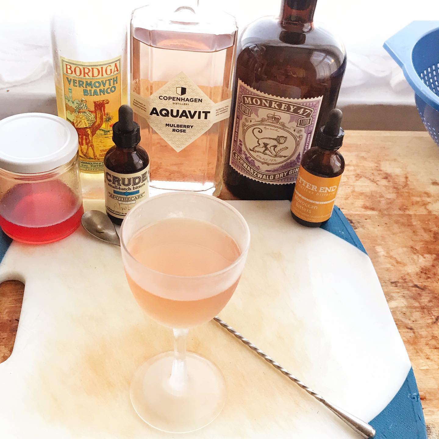 The herbal, floral, and spice notes in the Danish unaged aquavit work really nicely with the botanicals in the gin. The Blanc vermouth softens the drink while adding complementary white wine notes and the splash of raspberry syrup boosts the berry note in the summer aquavit. The bitters add some notes of rhubarb, vanilla, lemon peel, and sumac that nicely tie together flavors. Easy drinking, yet flavorful!