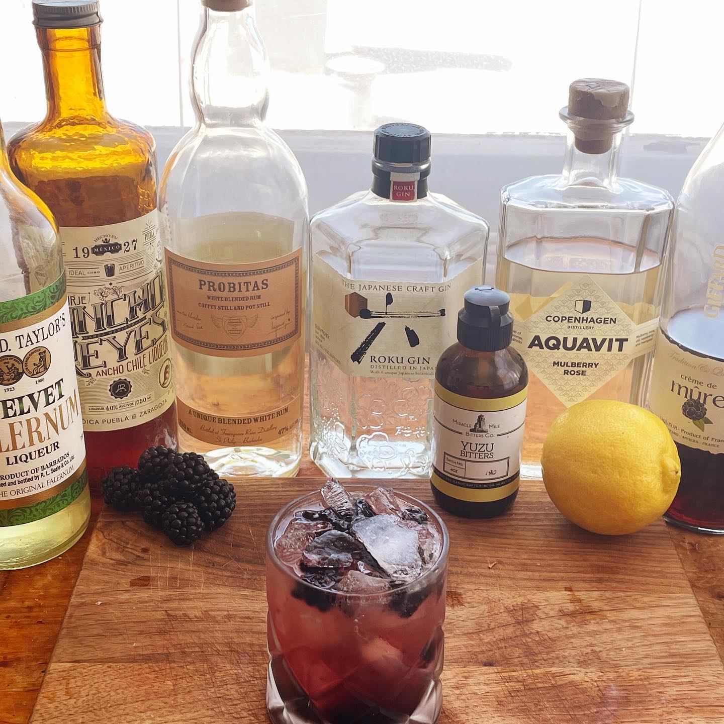 The blend of Japanese gin, infused Aquavit, and funky rum creates a base with notes of yuzu, juniper, caraway, flower petals, mulberry, and grassy funk that help highlight the flavor of the ripe blackberries (from the muddled berries and liqueur). Fresh lemon juice helps balance the acidity while splashes of Falernum and Ancho chile liqueur add complementary spice/spicy notes and depth. A dash of Yuzu bitters helps boost the floral and citrus elements