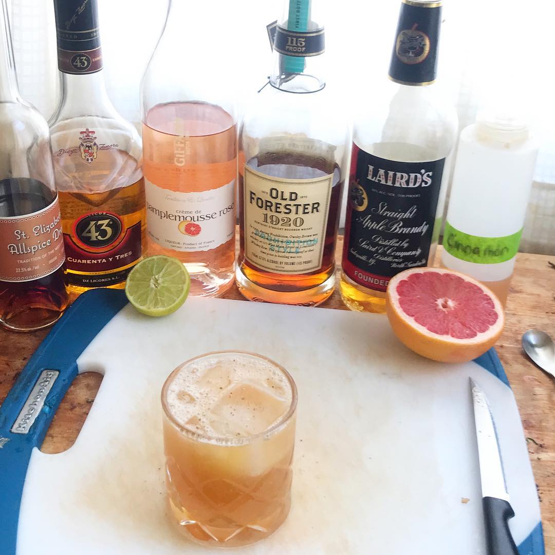 The overproof bourbon and bonded apple brandy provide a strong base with notes of caramel, apple, vanilla, oak, and cinnamon which are boosted by the Allspice, Cinnamon, and vanilla aspects of the sweeteners. The use of both grapefruit and lime provides a layered, bright citrus contrast with the grapefruit liqueur providing an additional juicy note