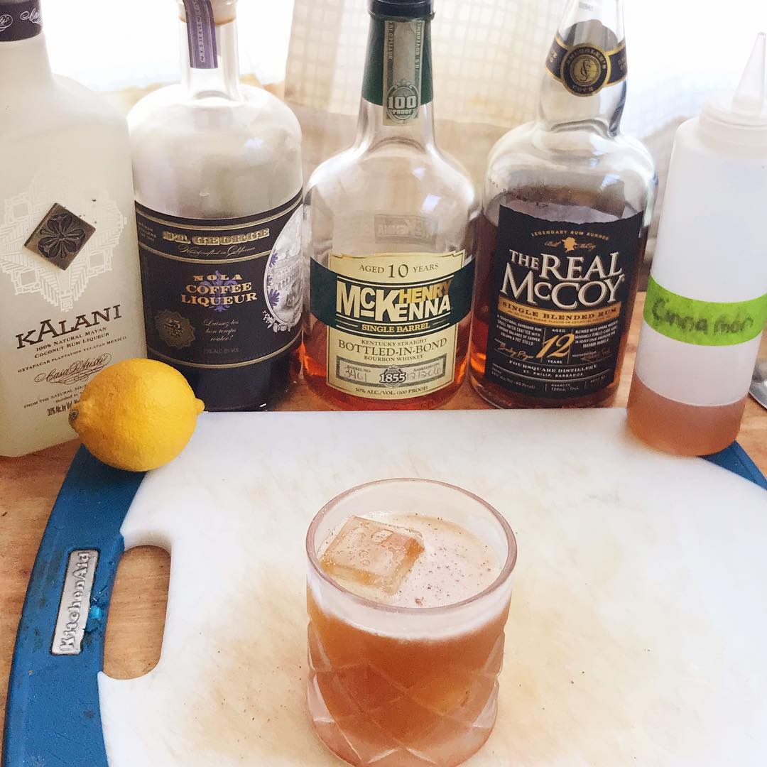 The baking spice, dark fruit, coffee, and vanilla notes in the Bourbon and bourbon-barrel aged Bajan (from Barbados) rum are boosted by additions of coffee liqueur and cinnamon while the bit of coconut liqueur adds a welcome tropical note. The bit of lemon brightens and lightens the drink