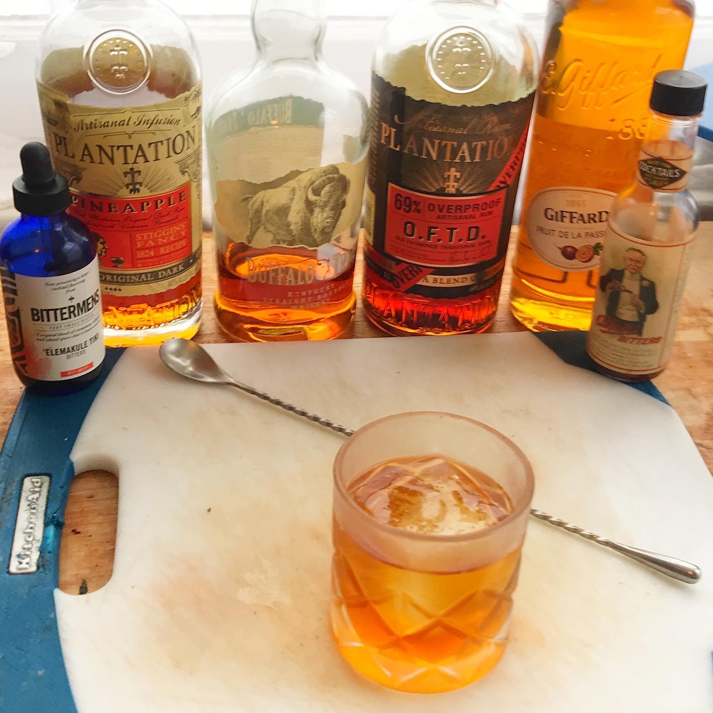 A rich, tropical Old Fashioned riff that combines fruit and spice in a transportive way 🚀💫 The woody oak barrel and cinnamon/vanilla notes in the bourbon are accented by the pineapple rum and passionfruit, while the Overproof Dark rum cuts the sweetness while adding notes of dark fruits and coffee and the bitters bring cinnamon, ginger, and allspice