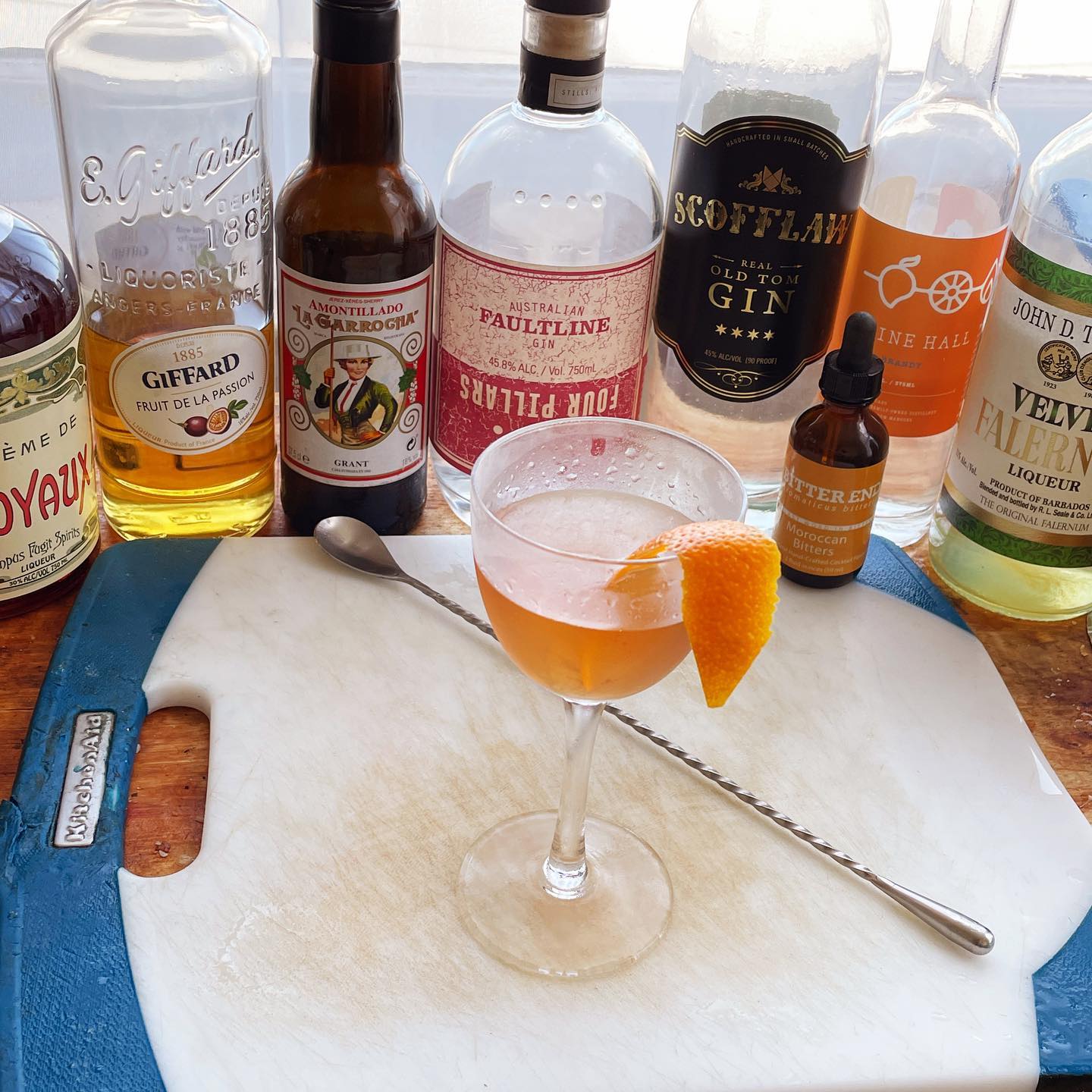 The notes of juniper, citrus peel, and other botanicals in the gin blend work nicely with the sweet/tart notes in the passionfruit liqueur. Splashes of mango brandy and Falernum help boost the tropical fruit and spice notes while the combination of the amontillado sherry and Creme de Noyeaux (liqueur from apricot pits, almonds) helps lend some of the nutty notes that orgeat brings to the original while also helping dry out and balance the drink. The dash of the preserved lemon/sumac forward Moroccan bitters and essential oils from the orange twist brighten the drink and bring some citrus aroma to each sip