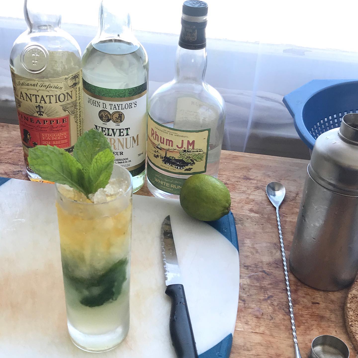 The larger than normal pour of Falernum lends a pronounced clove and allspice note to the drink (while also providing the sweet element of the drink. The addition of unaged agricole rhum lends a grassy, sugarcane note with a bit of funk and the lime brightens the drink and adds acidity. The float of pineapple rum adds tropical fruit notes and a bit more oomph while the fresh and shaken mint adds a cooling note and pleasant aroma. Very refreshing on a warm day!