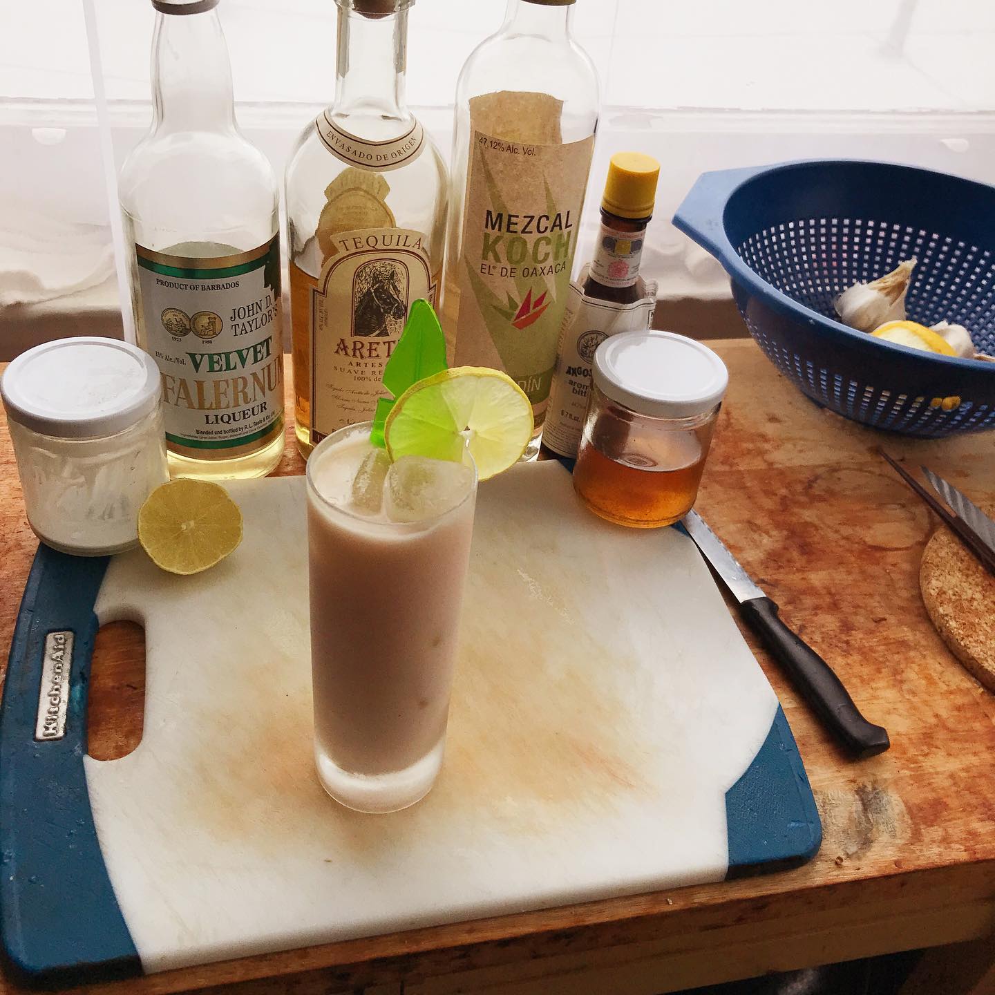 A decadent, spiced Pina Colada riff from Rain Miller of Nashville’s Noelle that makes expert use of some south of the border spirits 🥥 🇲🇽 The rich coconut flavor pairs very well with the butterscotch and baking spice notes in the reposado tequila. The clove and lime zest notes in the falernum work with the cinnamon syrup and allspice notes in the Angostura to boost the spice flavors, which are also complemented by the smoke notes in the mezcal. The addition of lime cuts the richness while bringing some fresh acidity
