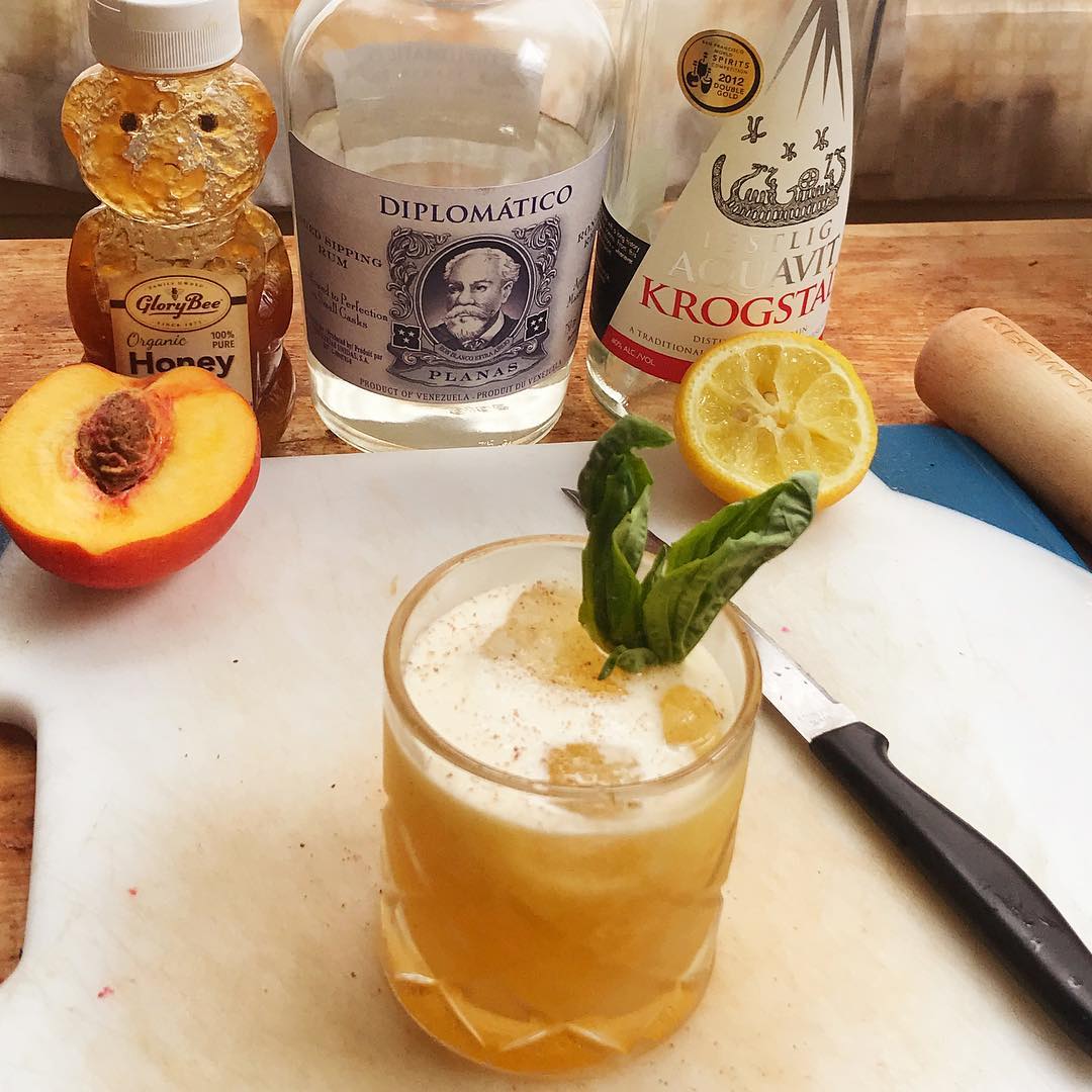 The sweet peach flavor is boosted by the honey syrup and carried through by the rum base while the star anise notes in the aquavit complement the herbal notes from the fresh basil and lemon lightens the drink