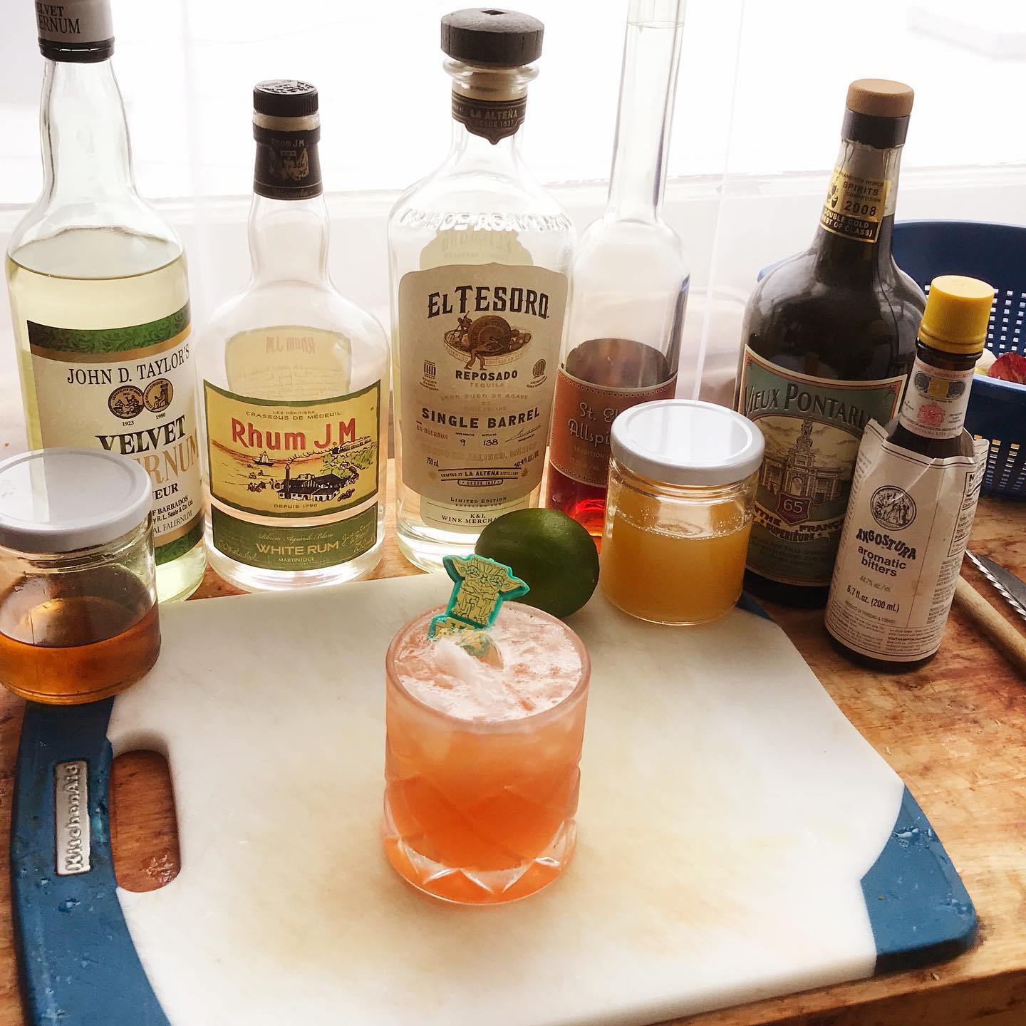 A delicious and refreshing modern Tiki punch from Chicago’s outstanding Lost Lake that features several guests from the spice cabinet and a bit of funk 🏝🗿 The baking spice and citrus zest notes in the reposado tequila work very well with the cinnamon syrup, allspice liqueur, and the clove notes from the Falernum and Angostura bitters. The unaged agricole rhum adds complementary notes of grassy sugarcane funk while the combination of lime and pineapple adds tartness, fluffiness, and a bit of fruit that works nicely. The touch of herbal Absinthe gives a bit of zip and a touch of floral aroma
