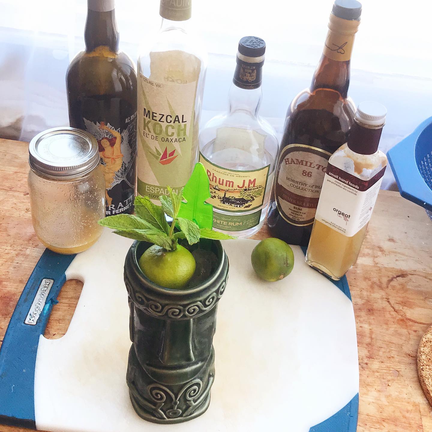 A Mai Tai riff (75th Anniversary this summer!) with some ginger bite and bittersweet notes from Shannon Mustipher 🏝🗿 The unaged agricole rhum and mezcal are blended with a heavier rum to bring darker and more funky/savory flavors to the forefront. These flavors are complemented by the bite of the ginger syrup and the float of bittersweet Fernet while the lime provides a bright citrus undercurrent and the orgeat balances the drink with a bit of nutty sweetness