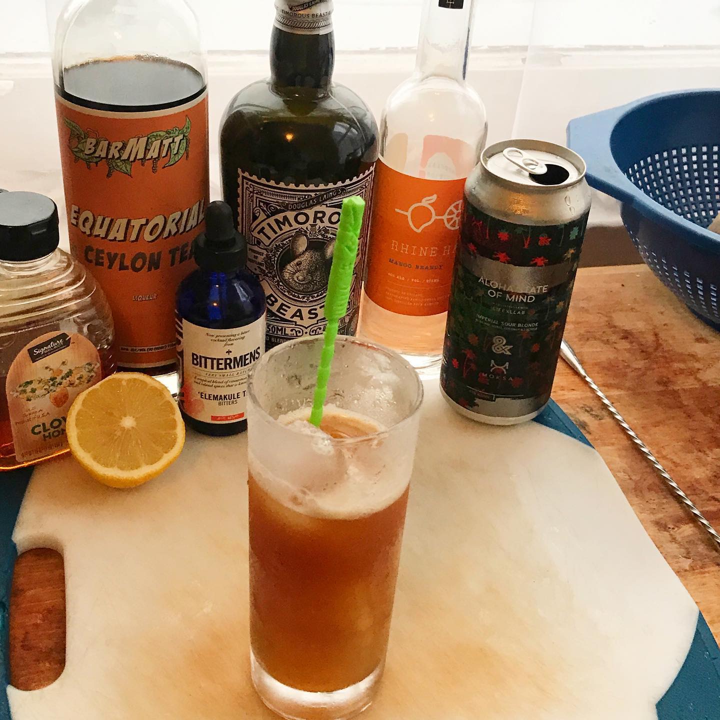 A low ABV beer cocktail/sling riff inspired by the idea of what an Arnold Palmer might taste like on the other side of the globe 🥭🍯 The mango brandy works alongside the tropical sour beer to deliver some intriguing fruit flavors that work really nicely with the black tea liqueur, the honey notes in the Highland scotch and honey syrup, and the ginger and cinnamon notes in the bitters. The splash of lemon and beer help balance the acidity and add effervescence .5 oz Highland Single Malt Scotch (Balvenie Doublewood, Glenmorangie, etc)