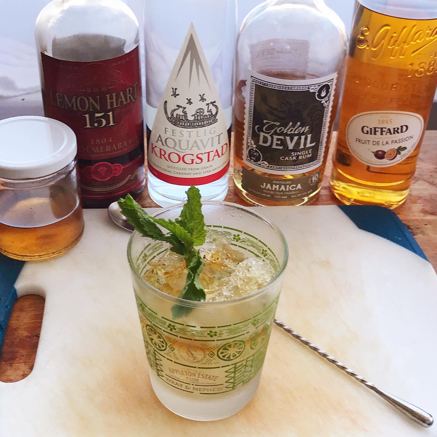 The star anise and black pepper notes in the images aquavit combine with the aged Jamaican rum to yield a base with loads of flavor and aroma. The additions of small amounts of cinnamon syrup and passionfruit liqueur add hints of baking spice and tropical fruit. The float of Overproof Demerara rum and mint bouquet yield an aroma of brown sugar, dried fruit and fresh mint (obviously)