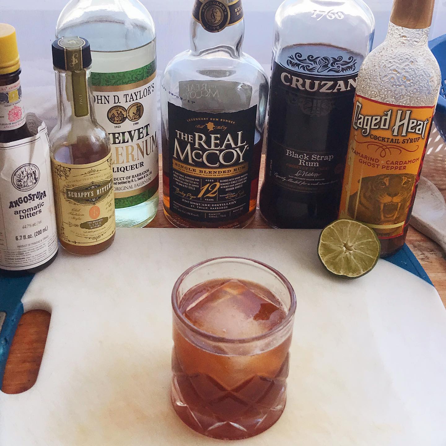 A smooth yet spicy Corn n Oil riff with robust flavors and a nice finishing kick 🌶🥃 The molasses notes in the blackstrap rum bring a rich undertone to the caramelized sugar, oak, and vanilla notes in the Bajan rum. These bold flavors provide a nice backdrop for the sweet/tart notes of tamarind, the ghost pepper in the Caged Heat and the clove/lime zest notes in the Falernum. A splash of lime and lime bitters wake the drink up with a bit of tart zip and the Angostura bitters boost the complementary allspice and clove notes.