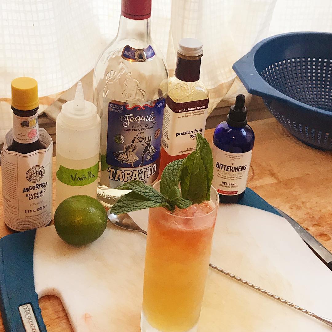 The tart passion fruit syrup and agave add intrigue to the usual citrus notes while the vanilla adds a bit of richness with the Habanero bitters adding a spicy finishing kick