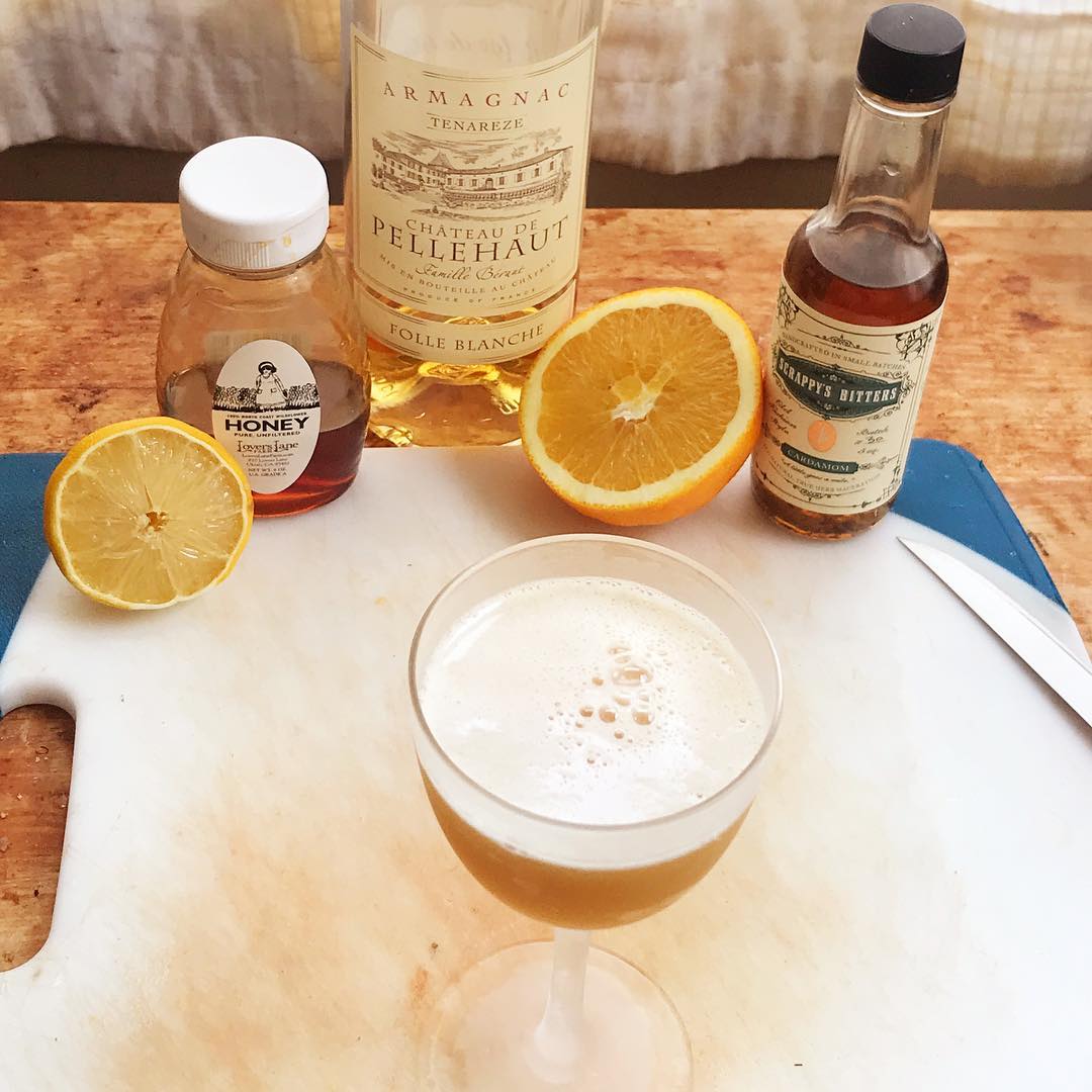 The apricot and subtle prune notes in the Armagnac mingle nicely with the honey syrup and citrus while being complemented by the lemon peel and savory cardamom notes in the bitters to result in a complex, yet refreshing drink