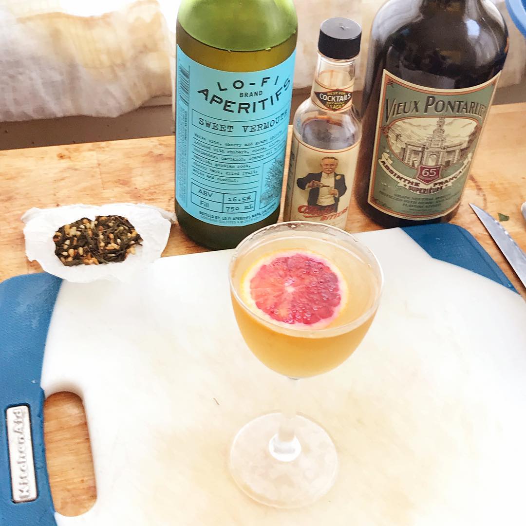 The earthy, grassy notes from the green tea blend very well with the floral and spice notes in the vermouth (works with Sweet, Dry, and Blanc versions, each with slightly different flavors) while the lemon oil and bitters boost the aroma