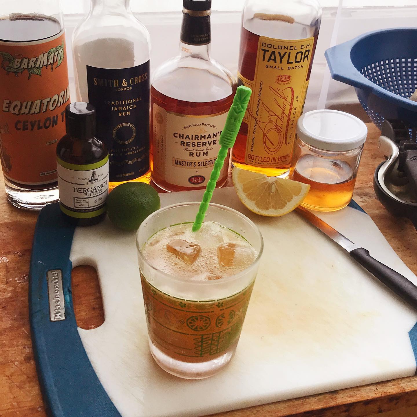 The combination of a vanilla and molasses forward column still rum with a funky Jamaican rum with tropical fruit notes is supplemented by the cinnamon and oak notes of the bonded bourbon. These flavors work wonderfully with the black tea, cinnamon, and grapefruit notes from the liqueur/syrup/citrus while some lime juice balances the flavors and the Bergamot bitters boost the tea notes