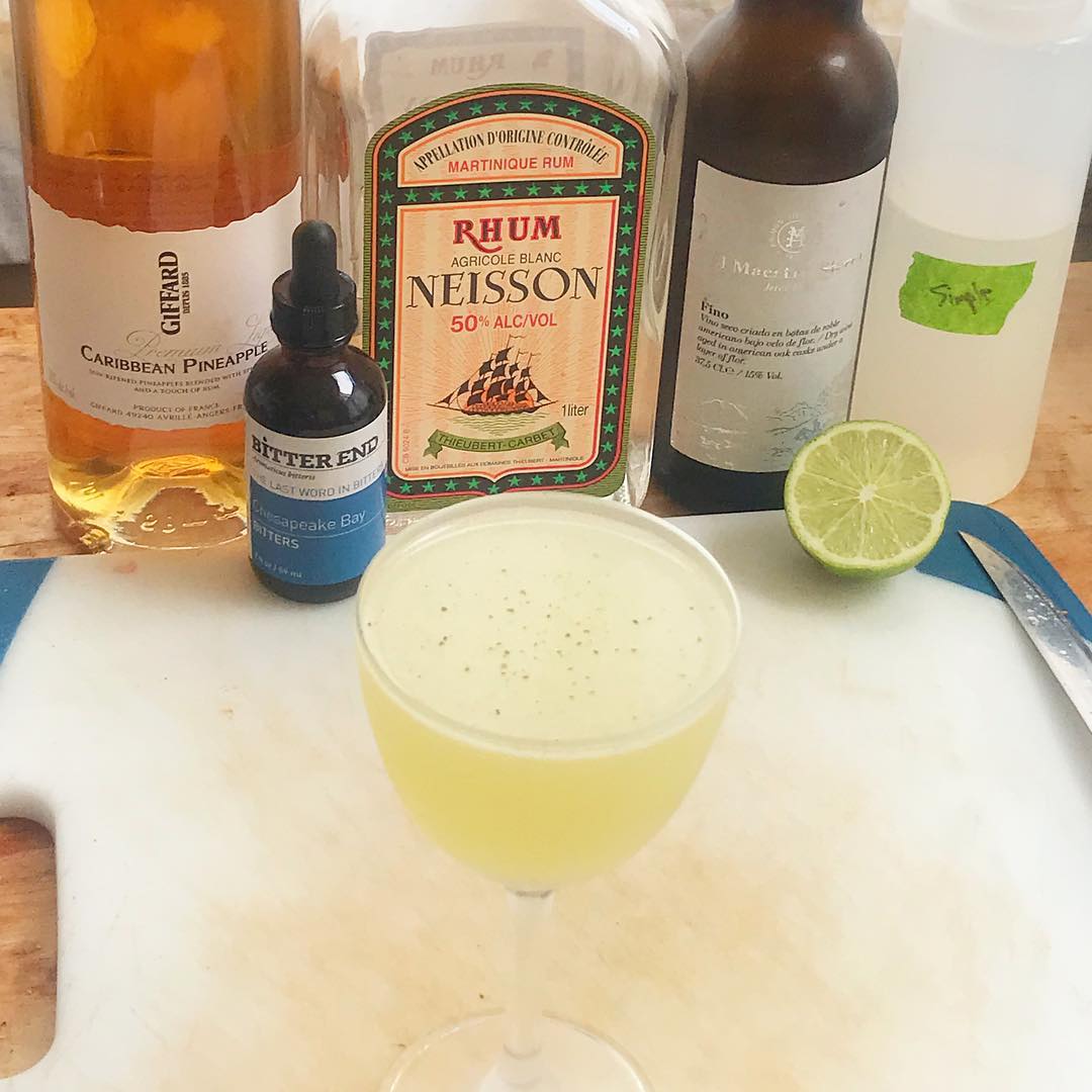 The grassy, funky agricole rhum is supplemented by the nutty, dry Fino sherry and rich pineapple with the Bay leaf and cayenne notes from the bitters bringing a bit of spice and the lime bringing acidity