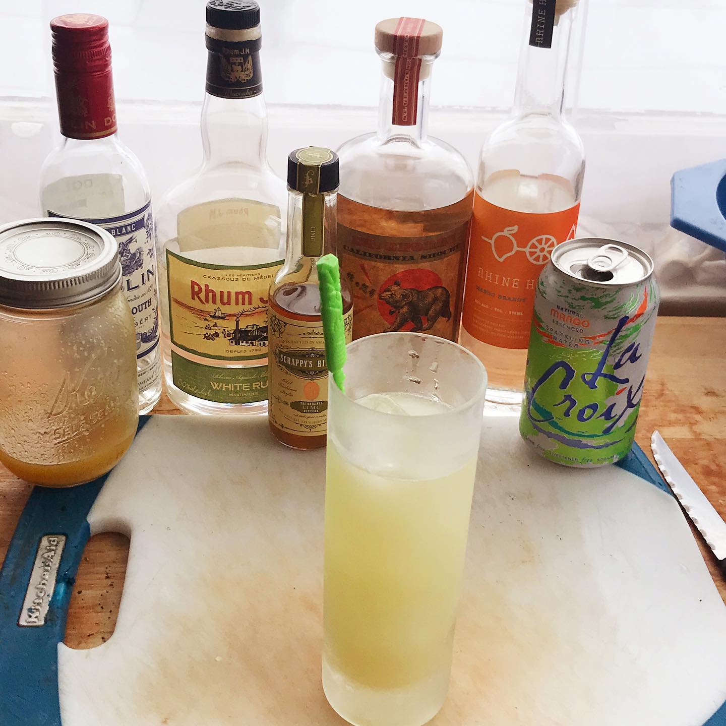 The Japanese shochu (a spirit distilled from rice) and Agricole rhum provide a flavorful base with some grassy cane and malty notes that work well with the spice notes from the ginger syrup and the ripe mango flavors from the eau de vie. The vermouth adds a bit of additional sweetness, the lime bitters bring a bit of lime zest freshness, and the Mango LaCroix adds effervescence and subtly boosts the mango flavors