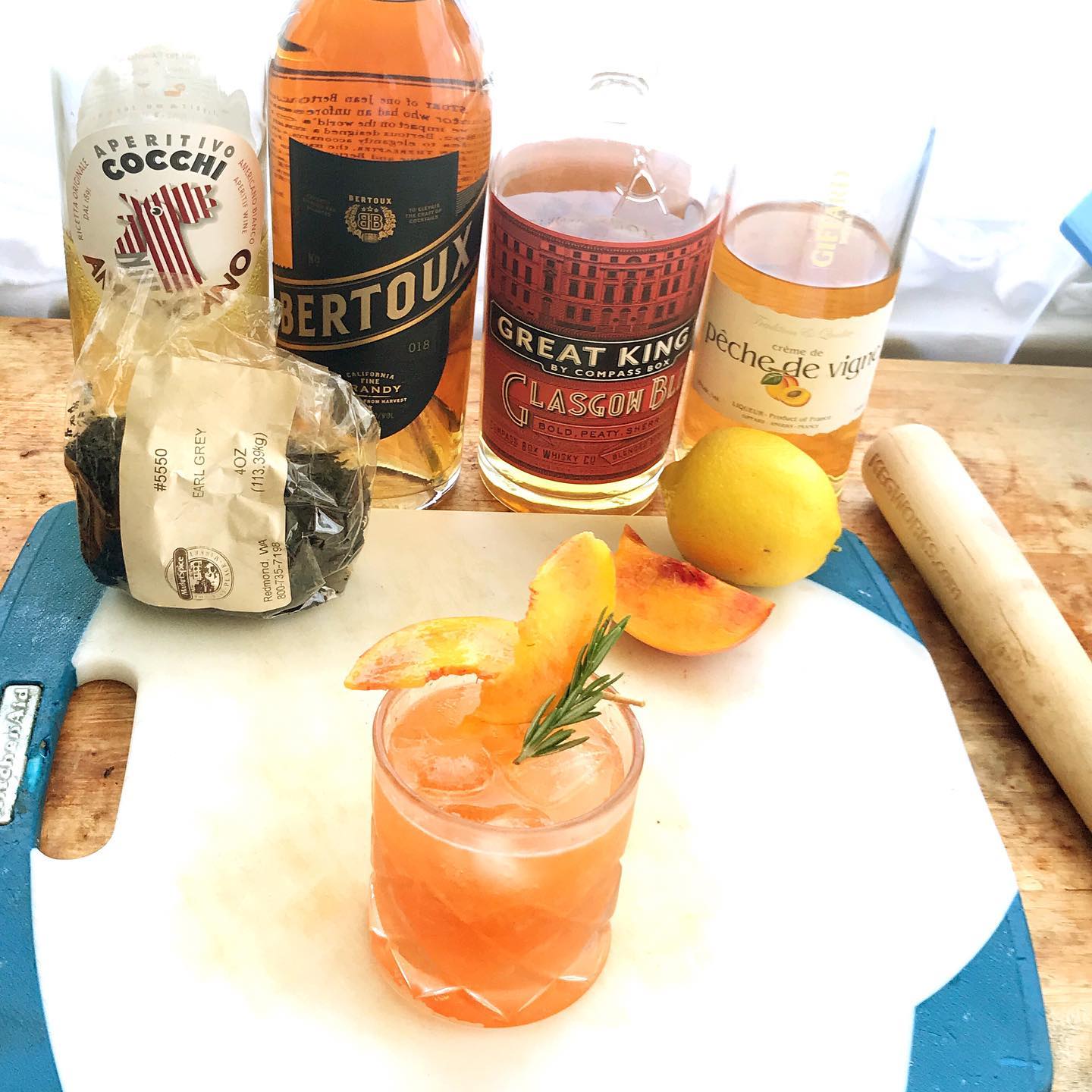 The brandy and blended scotch provide a flavorful base with notes of fruit, vanilla, honey, and a whisper of smoke. These provide a nice canvas for the tannins, citrus peel, and bergamot in the black tea syrup, the stonefruit notes from the ripe peach and liqueur. The lemon lengthens and brightens the drink, the white wine-based aperitif bridges flavors, and the rosemary provides a pleasant aroma