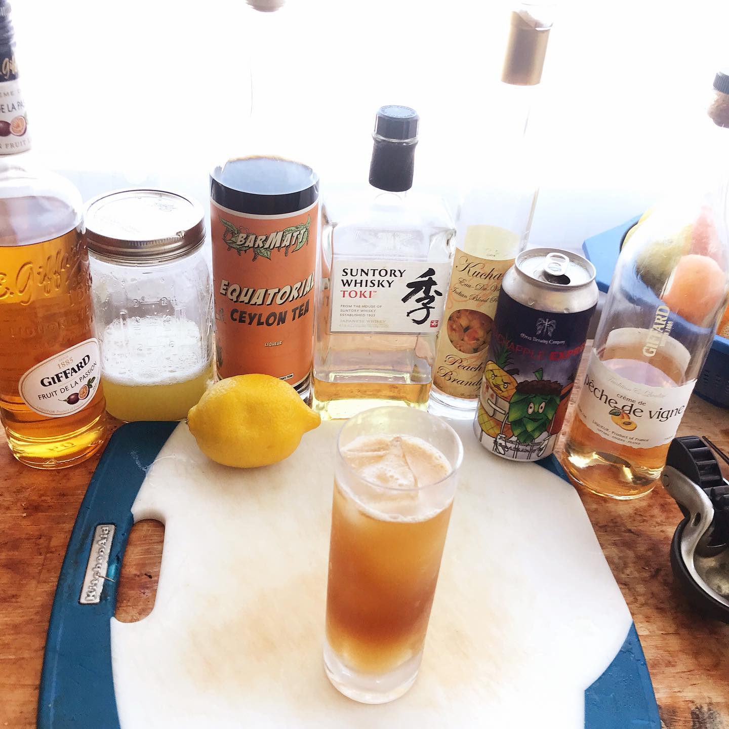 A tall, refreshing beer cocktail that riffs on the Arnold Palmer and peach iced tea 🍑🍍 The Japanese blended whisky and peach eau de vie combine to form a flavorful base with plentiful stonefruit notes and a touch of honey. The flavorful yet tart peach/pineapple sour beer combines with the pineapple juice, lemon, and black tea liqueur to produce a delicious mixture that has citrus, dry tannins and is reminiscent of an Arnold Palmer. Additions of splashes of peach and passion fruit liqueurs boost the fruit flavor and balance the acidity. Refreshing and dangerously drinkable!