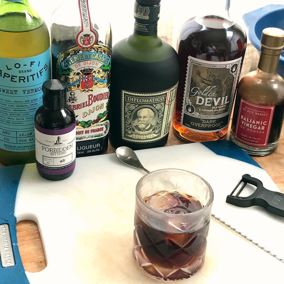 The deep berry flavor combines with the molasses and cola notes in the two rums and the cocoa notes in the vermouth to give a deep, yet fruity flavor reminiscent of Cherry Coke (with tasty rum finish instead of soda) while the bit of Aged balsamic cuts the sweetness and adds nuance