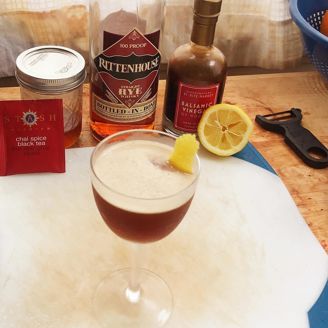 The spice notes in the rye integrate very well with the cinnamon, cardamom, and clove notes from the Chai tea syrup while the bit of balsamic vinegar adds nuanced sweetness while also combining with the lemon to give a more nuanced acidity