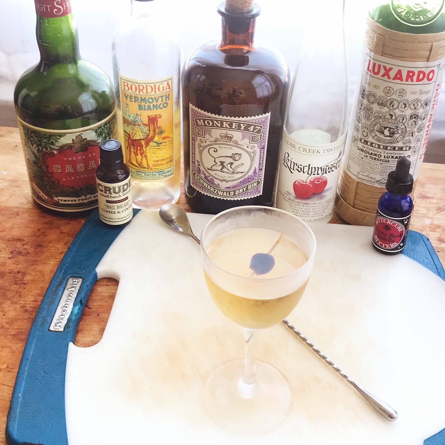 A delicious after-dinner Martini riff inspired by the flavors of a German Black Forest cake 🍒🍫🧙🏻♀️ The bountiful botanical flavors and aromas present in the excellent Monkey 47 gin (itself from Germany’s Black Forest) works wonderfully with the dry Cherry Eau de Vie (more popularly known as Kirschwasser in Central Europe) and Creme de Cacao to give a drink that is gin-forward but has the requisite cocoa and cherry notes for Black Forest cake. The relatively mild Blanc vermouth helps lengthen the drink while not muddying any flavors and the splash of Maraschino liqueur and two bitters boost the cherry and cocoa notes. I’d like to imagine the father of Hansel and Gretel celebrated their return by toasting with this drink