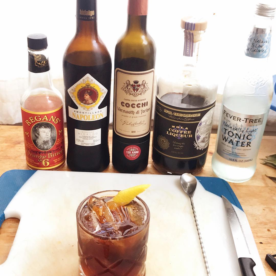 The vermouth and sherry provide comfort, spice, and nuttiness while the coffee liqueur and tonic provide nuance and a bit of bitterness. The orange bitters add a bit more intriguing cardamom and orange peel notes
