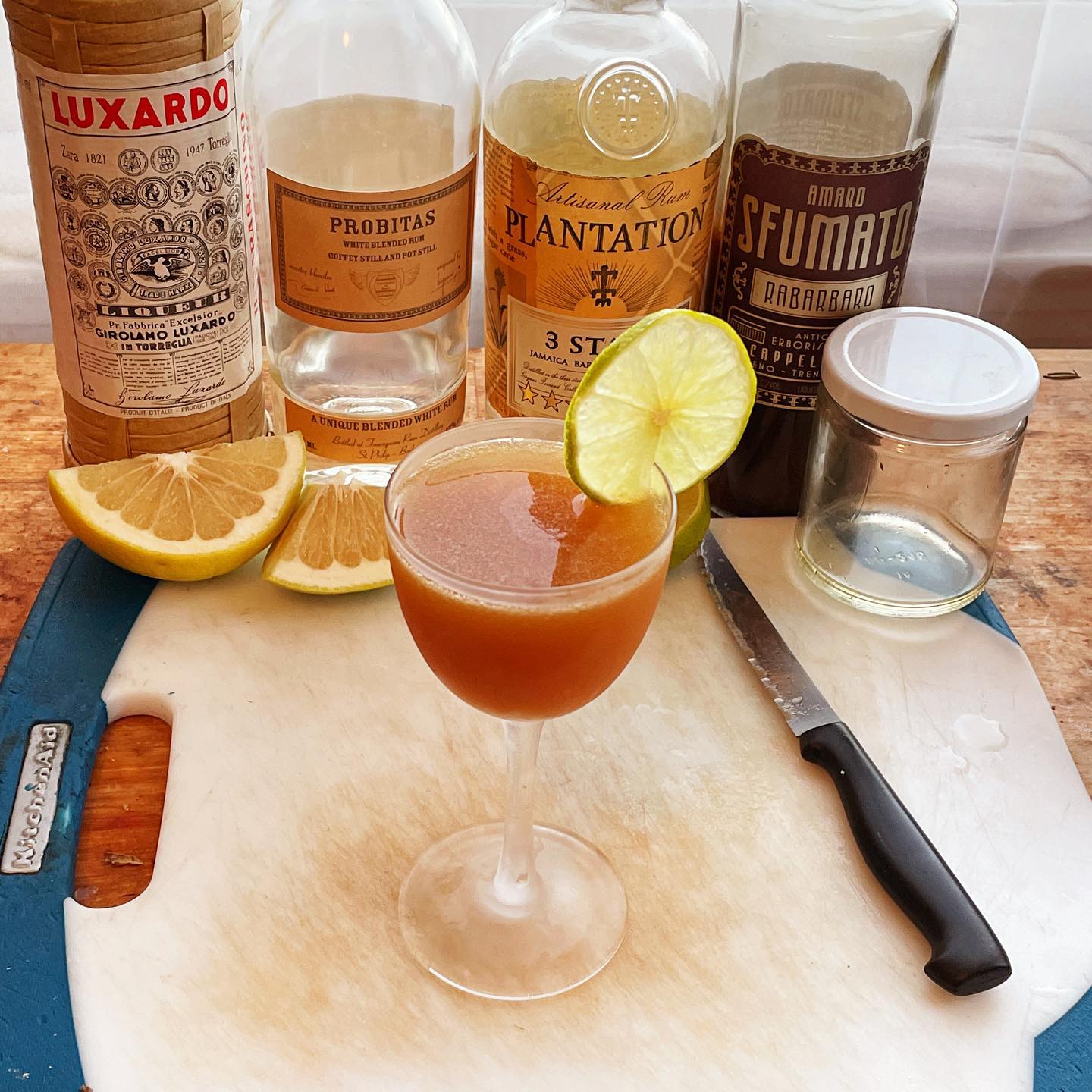 The classic combination of citrus and cane sugar in the lightly aged rum along with the tart citrus notes of the fresh lime and grapefruit juices is augmented by the bittersweet and smoke notes of the smoke rhubarb of the Amaro Sfumato while the maraschino liqueur adds a bit of funk and the simple syrup adds body (a cinnamon bark syrup substitution could also work nicely)