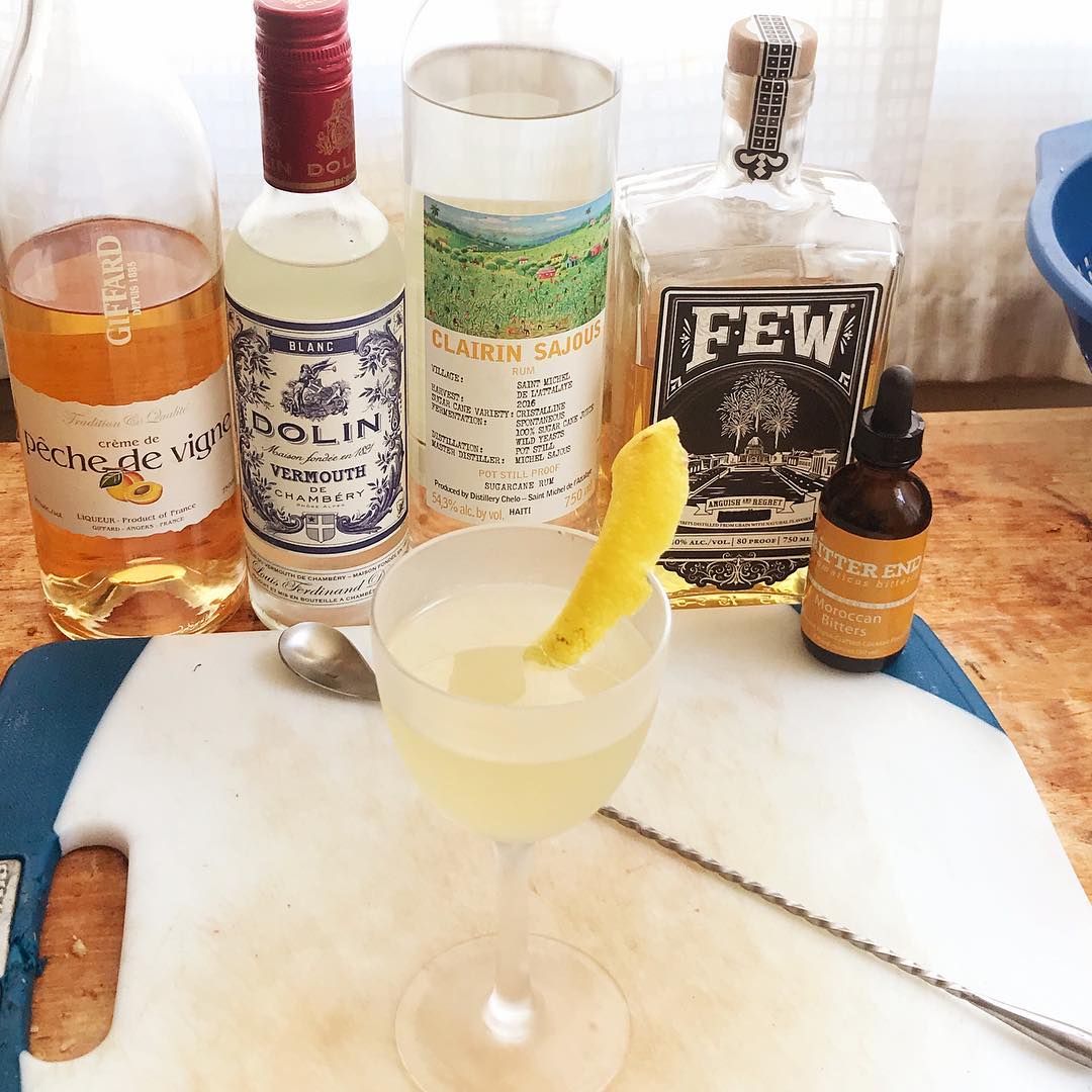The buttery, grassy sugarcane sweetness and funk of the Haitian Clairin are complemented by the floral notes in the Few Malort and the peach Liqueur bridges the two flavors with a bit of underlying sweetness while the vermouth adds some additional chamomile notes and the bitters bring a bit of spice