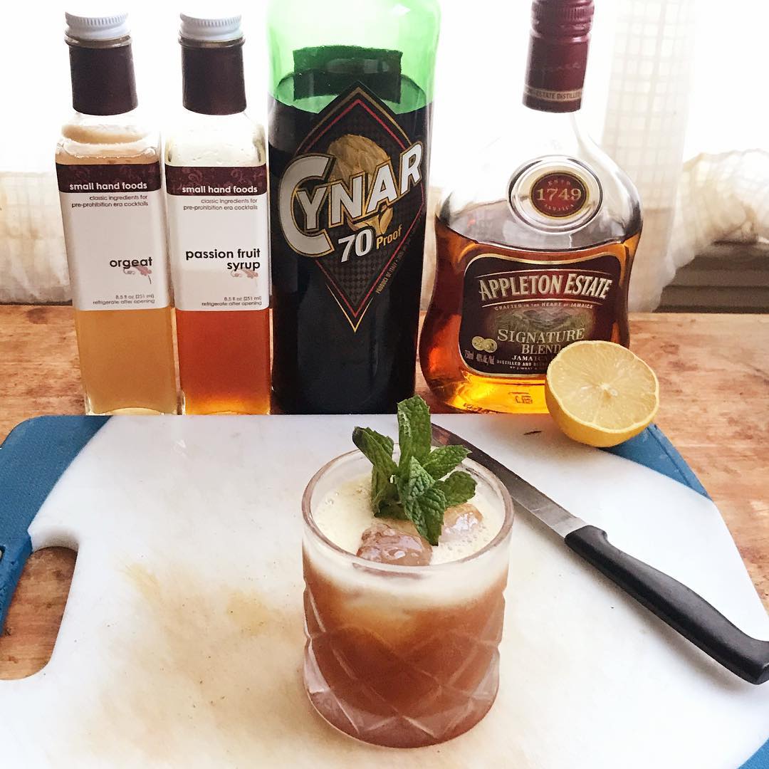 The bittersweet Cynar and tart/sweet passionfruit syrup combine to yield a flavor that is close to cranberry while the orgeat contributes a nutty sweetness, the Jamaican Rum adds notes of tropical fruit, and the lemon brings acidity