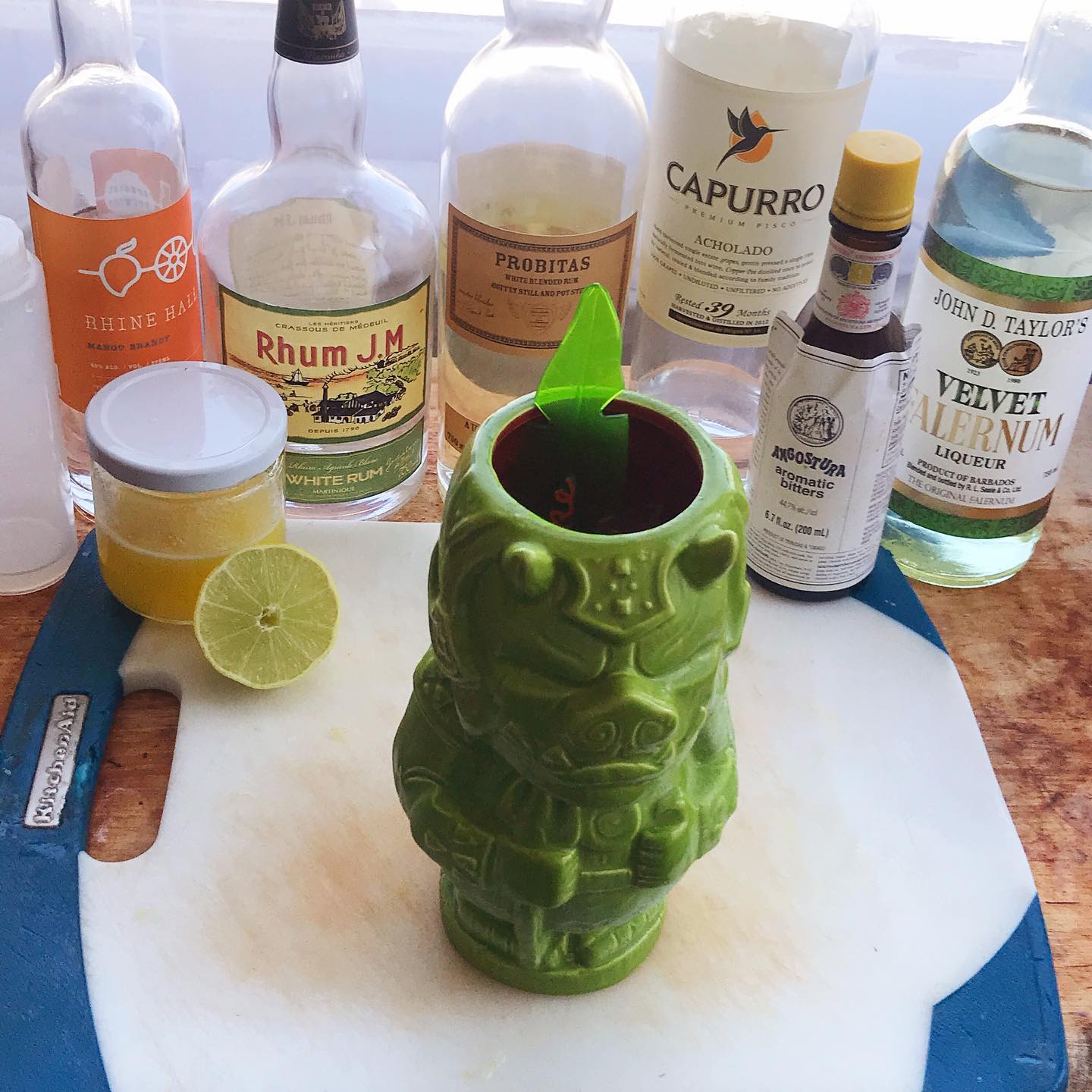 A refreshingly exotic Tiki concoction from SF’s Zombie Village with tropical fruit and spice accents 🍍🥭 The blend of tropical Jamaican rum and Bajan column still rum, grassy and funky agricole, and floral pisco yields a flavorful base that is accented by the bright pineapple and lime juice, the funky sweetness of ripe mango, clove notes from the Falernum, and vanilla-infused Angostura. An intriguing and delicious drink
